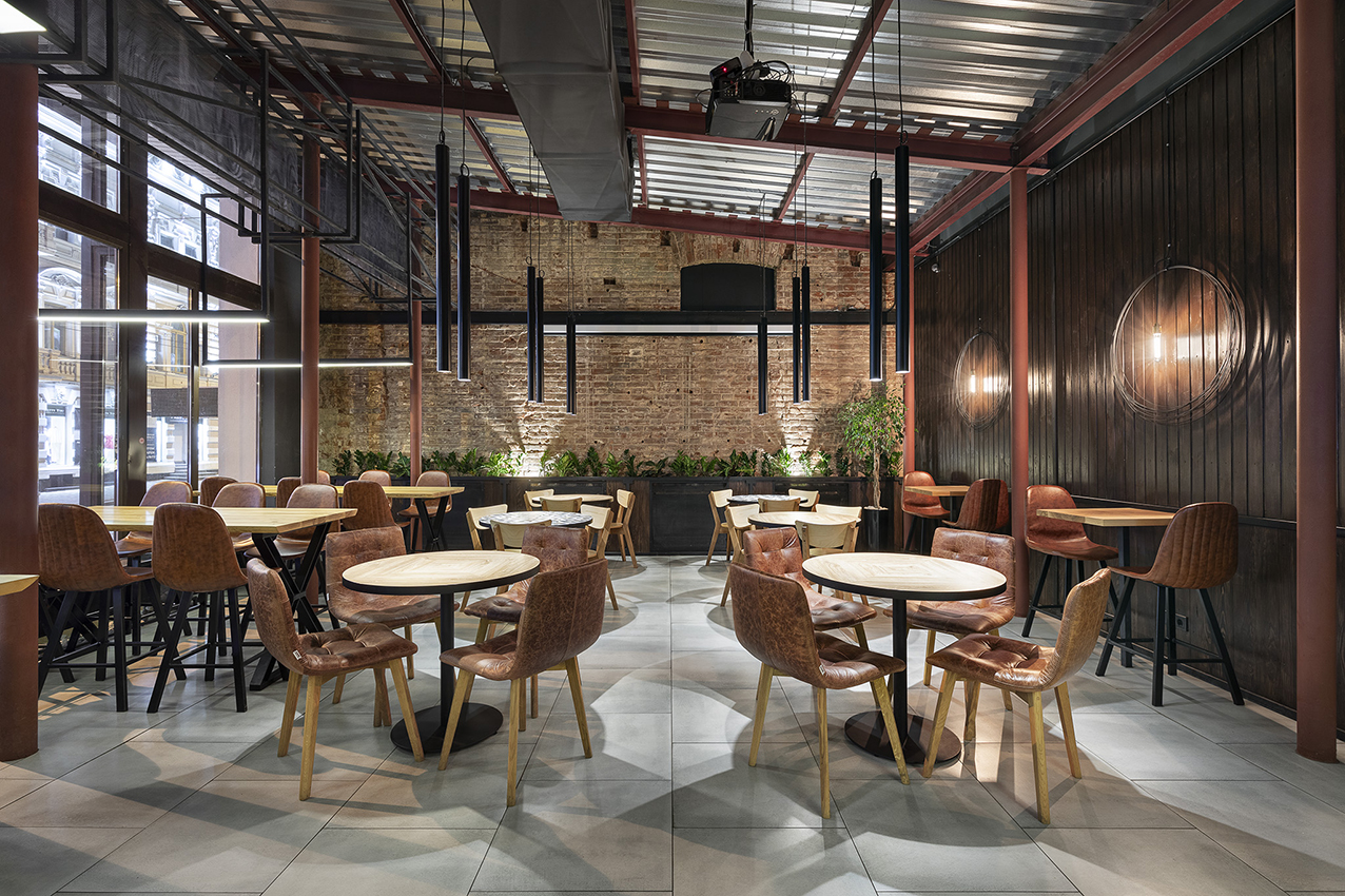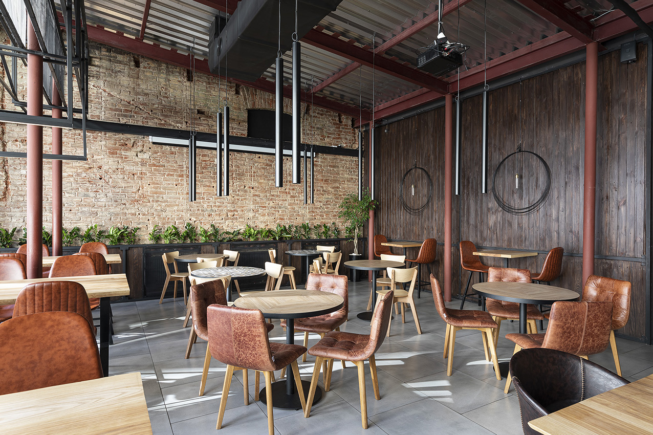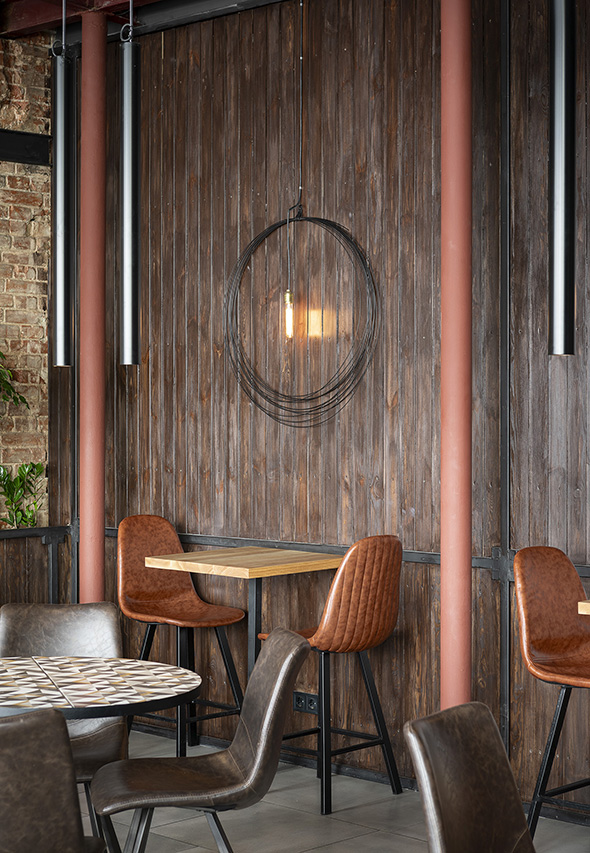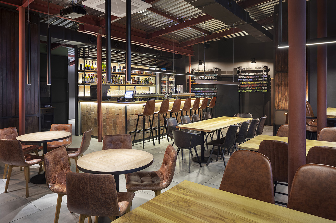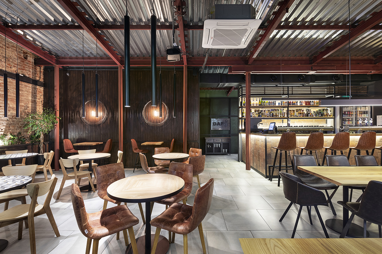 The planning decision involves the allocation of the following zones: a functional kitchen, two pub halls, a VIP hall, a utility room for a keg room, and a space for bathrooms. The main idea of the space is the bar counter, which has become a bright accent of the pub's interior. Getting into the first hall, it is impossible not to notice the bar counter with seating along it, a large number of beer taps and accent light. The bar counter divides the room into two functional zones - a dining area, and an auxiliary one - a kitchen, a keg room and bathrooms. Between the two halls there is a VIP hall for 10 people. The second hall is a competent interior of the pub - soft, sofa seating, communal tables for companies and tables for two and four. The "heart" of the DAF pub is stored in the keg - beer. A huge number of kegs are placed here, and for ease of operation and connection of kegs to taps, at the construction stage, a pipe system was laid in the floor between the bar and the utility room.