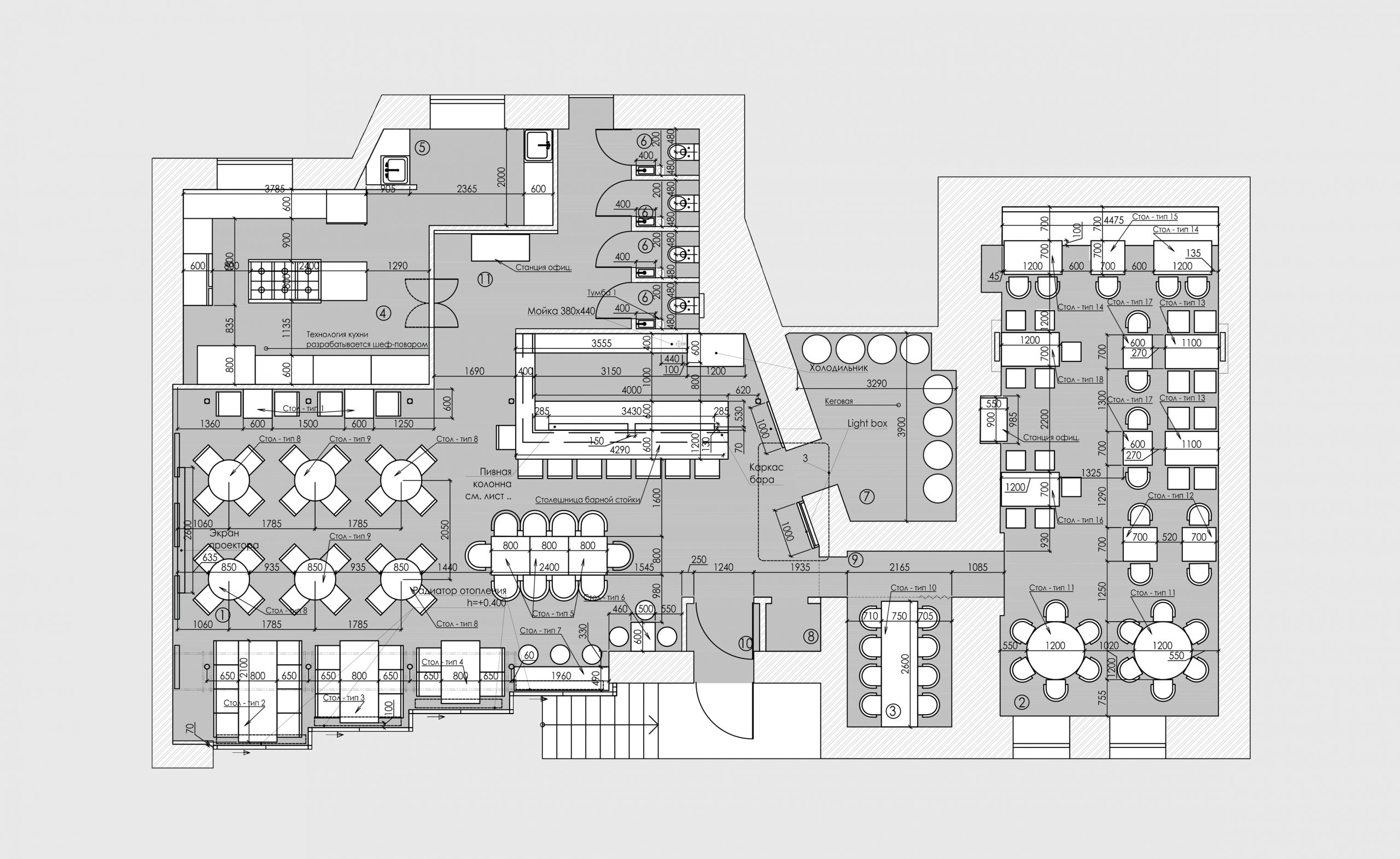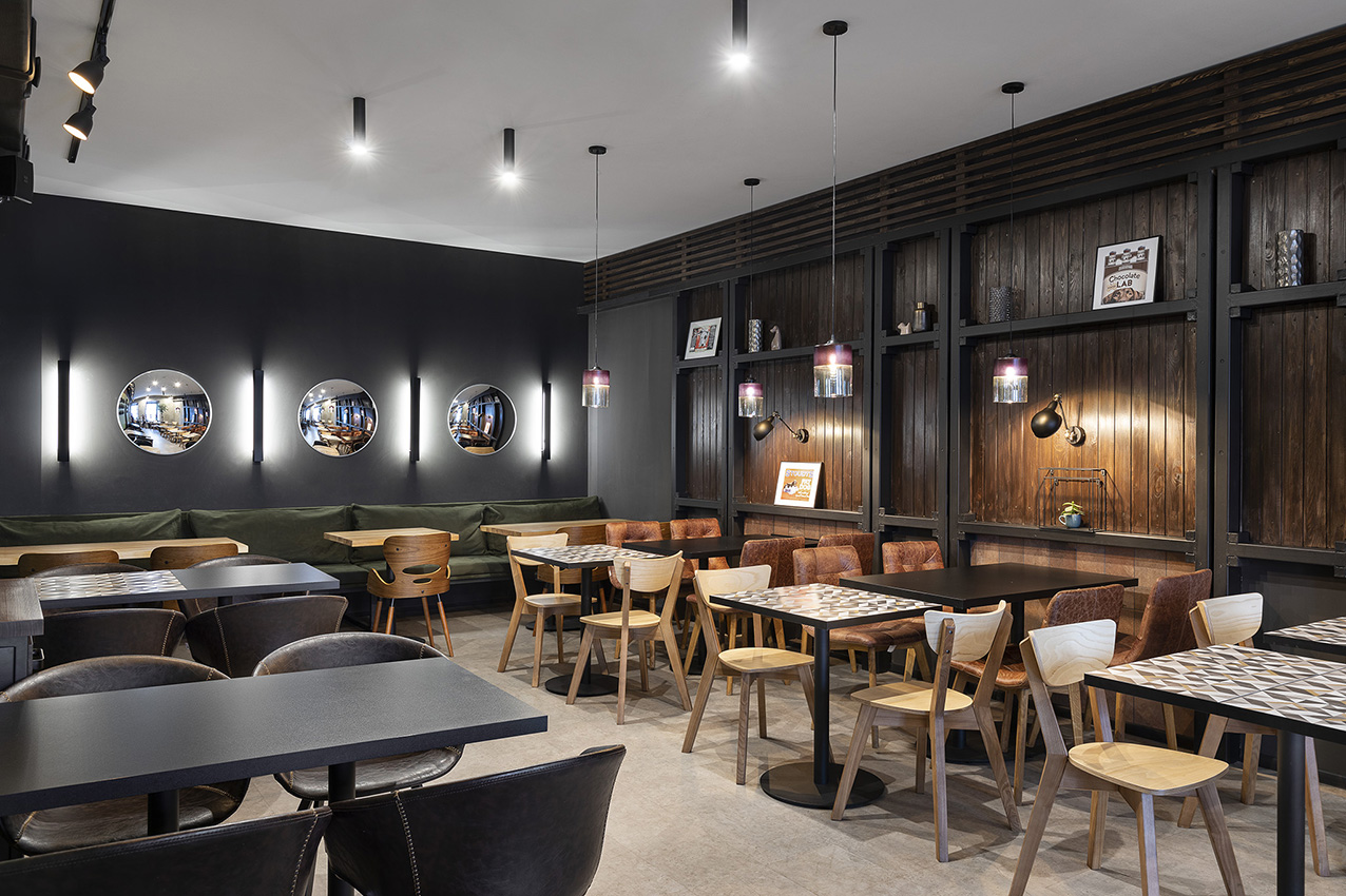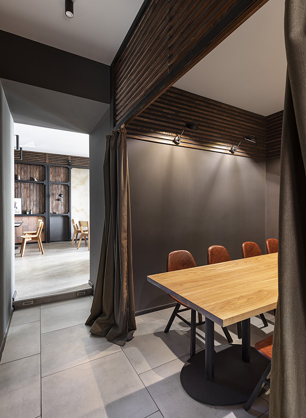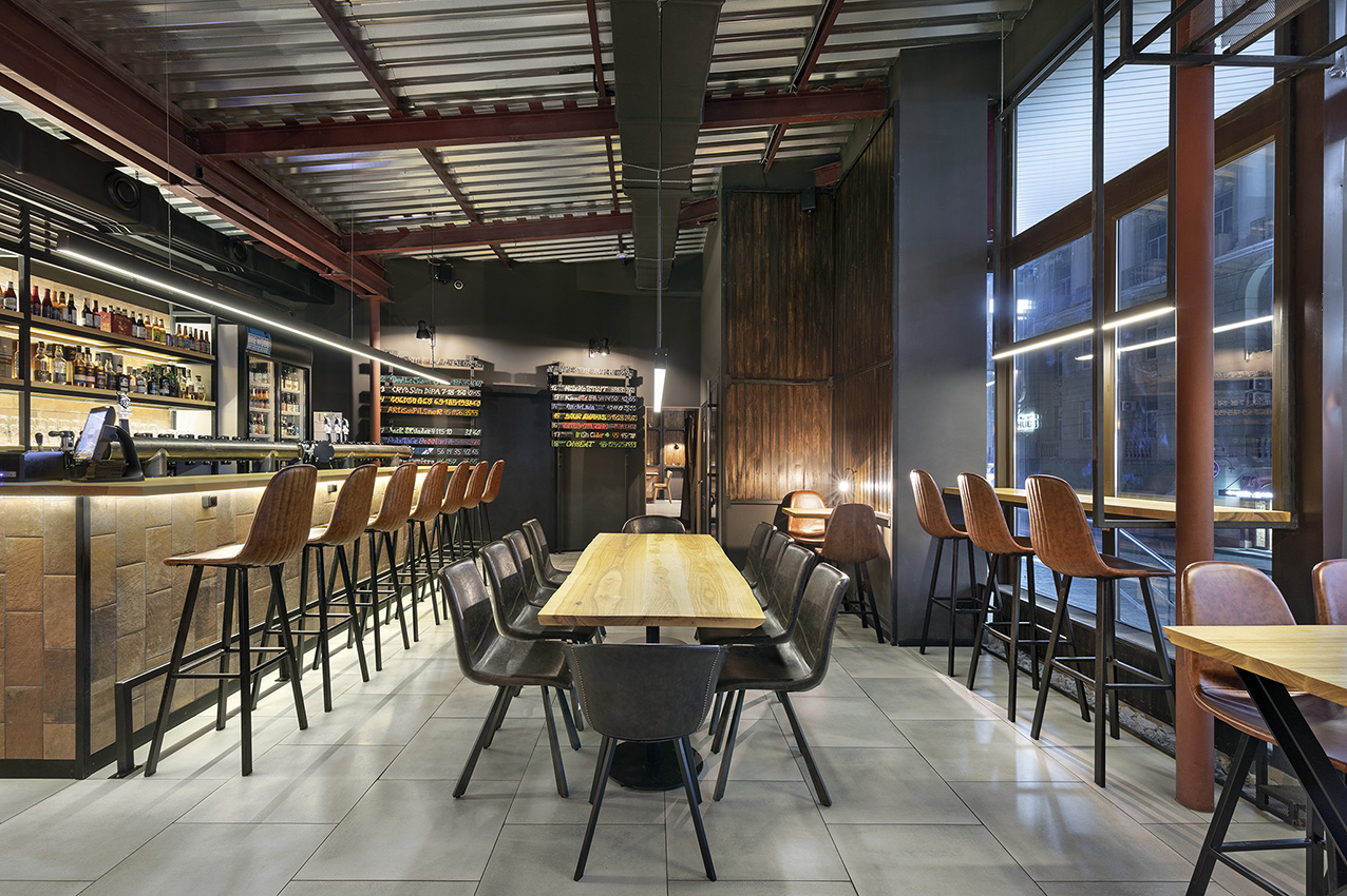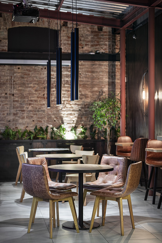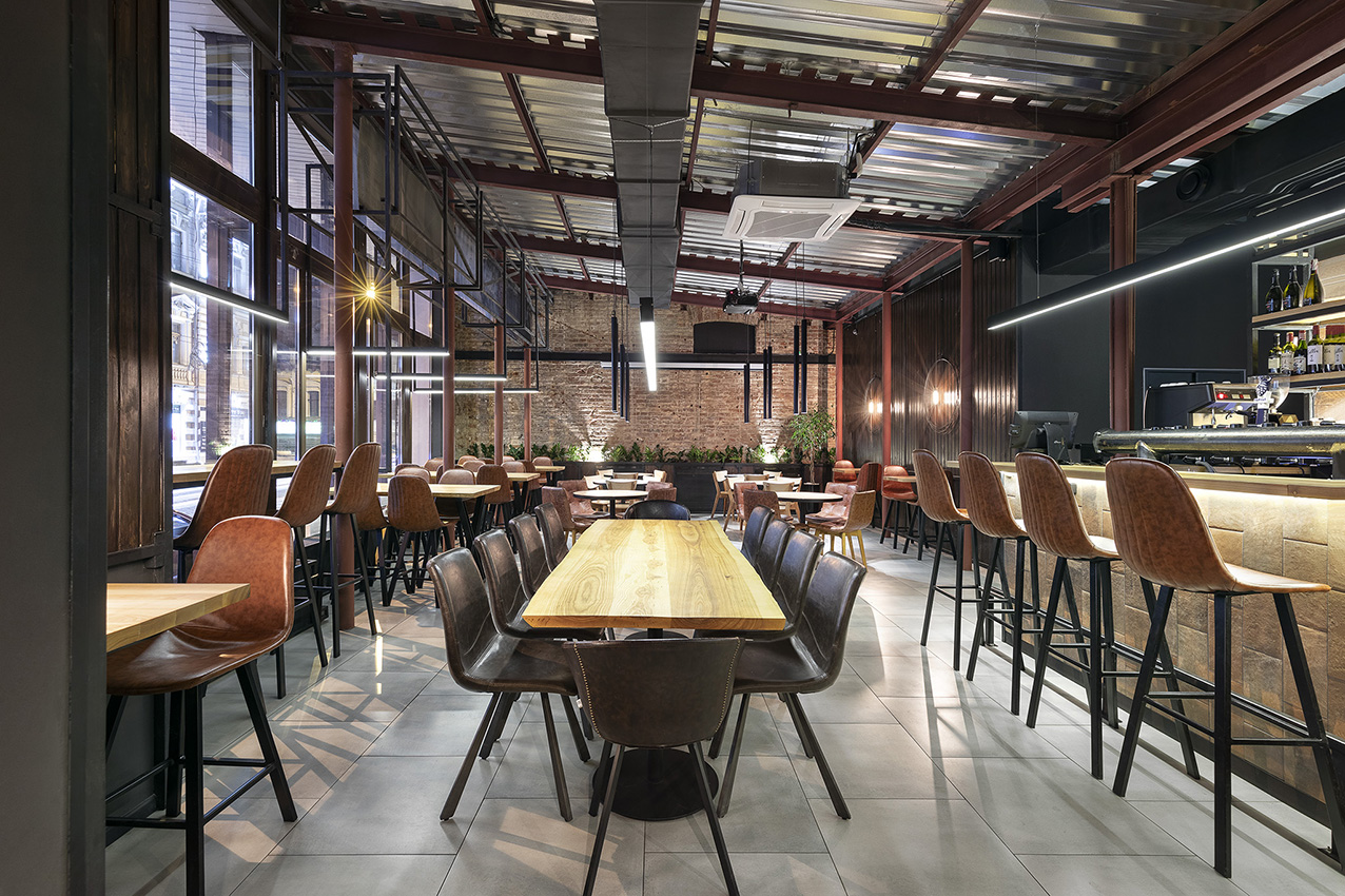 The planning decision involves the allocation of the following zones: a functional kitchen, two pub halls, a VIP hall, a utility room for a keg room, and a space for bathrooms. The main idea of the space is the bar counter, which has become a bright accent of the pub's interior. Getting into the first hall, it is impossible not to notice the bar counter with seating along it, a large number of beer taps and accent light. The bar counter divides the room into two functional zones - a dining area, and an auxiliary one - a kitchen, a keg room and bathrooms. Between the two halls there is a VIP hall for 10 people. The second hall is a competent interior of the pub - soft, sofa seating, communal tables for companies and tables for two and four. The "heart" of the DAF pub is stored in the keg - beer. A huge number of kegs are placed here, and for ease of operation and connection of kegs to taps, at the construction stage, a pipe system was laid in the floor between the bar and the utility room.