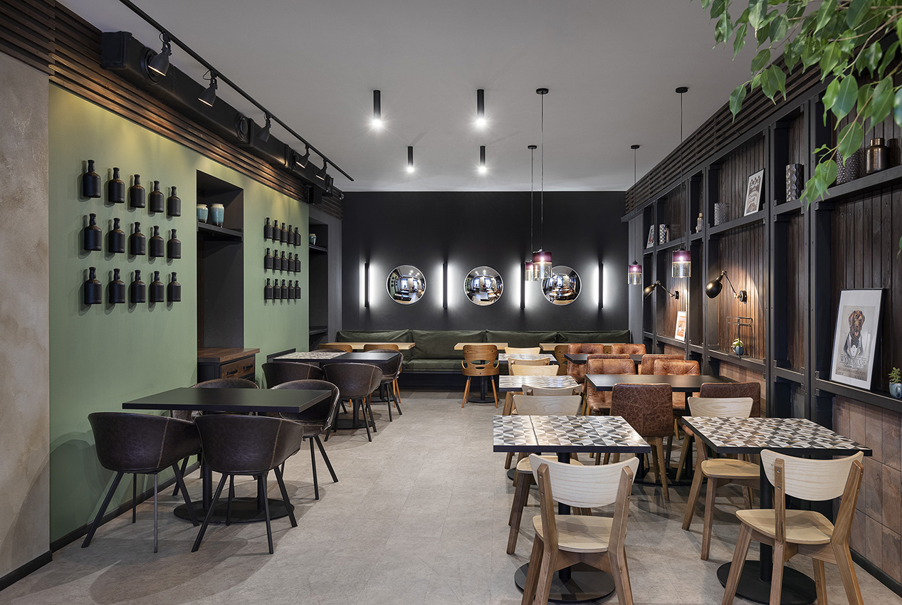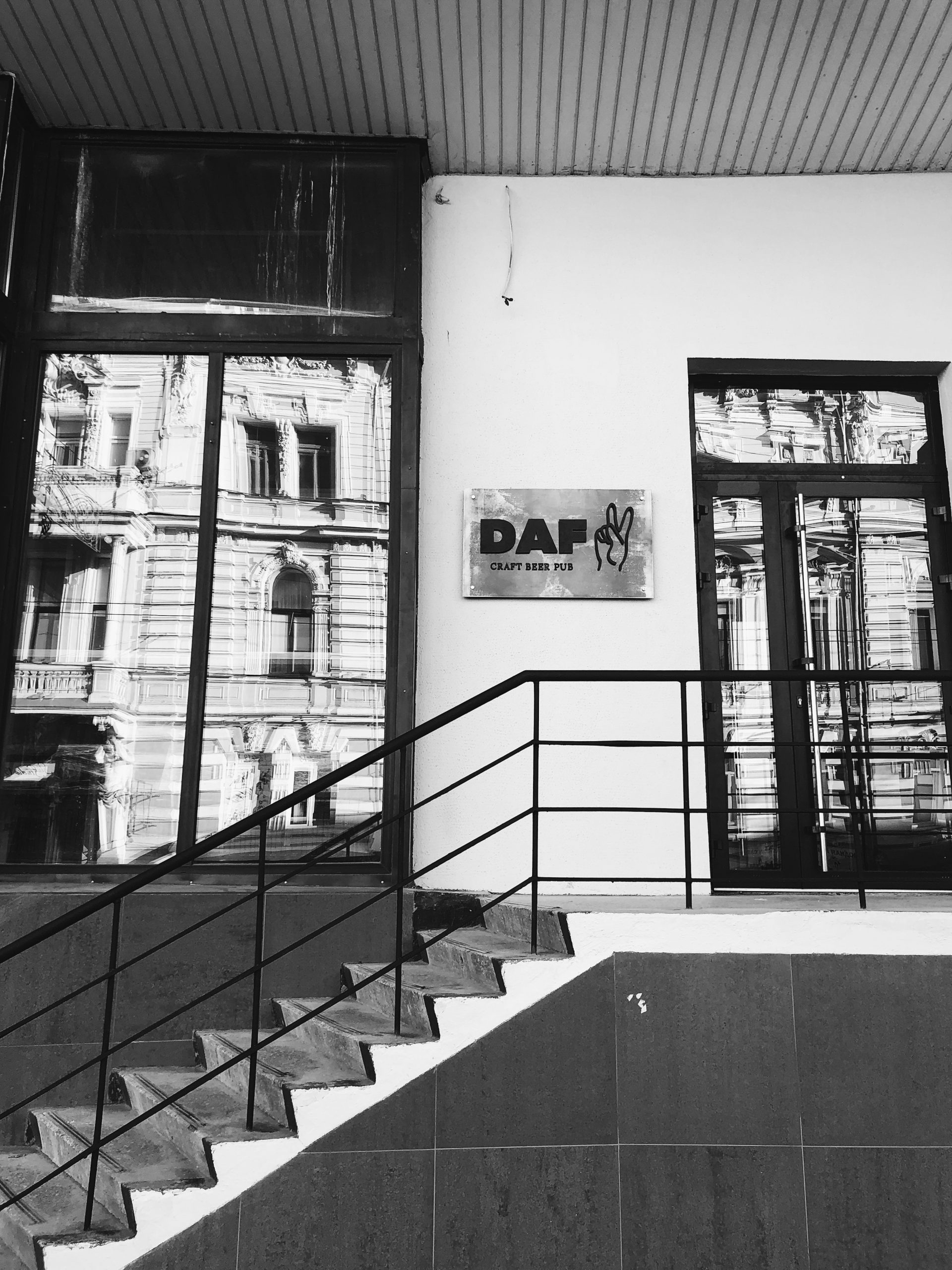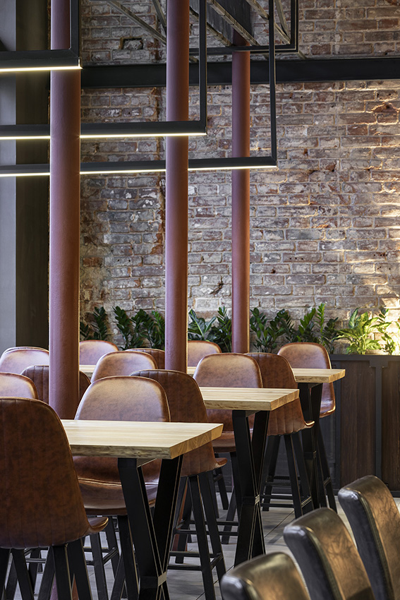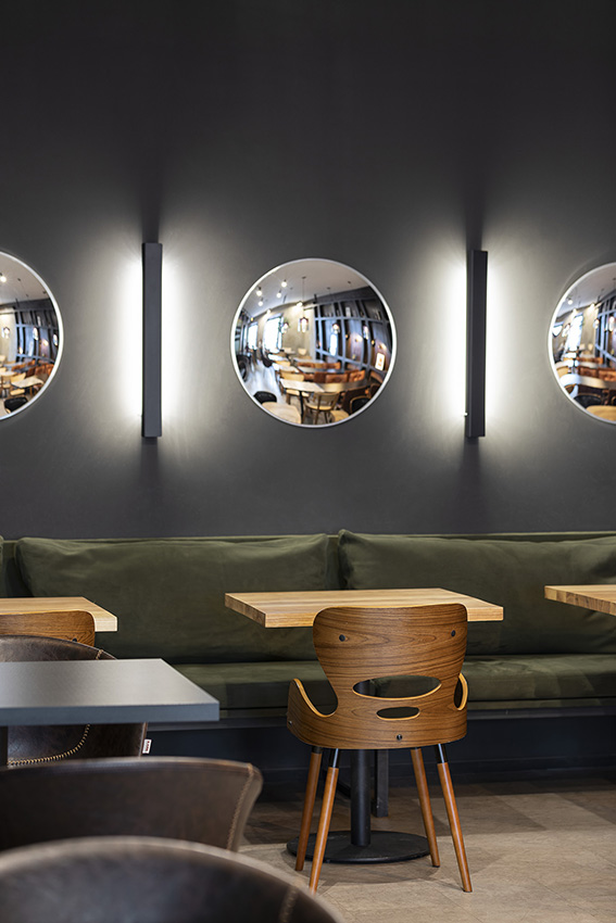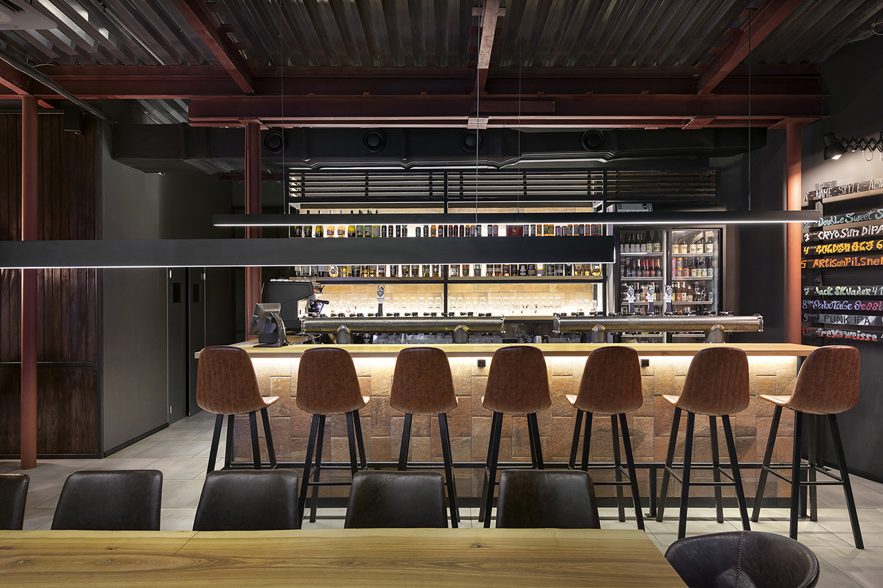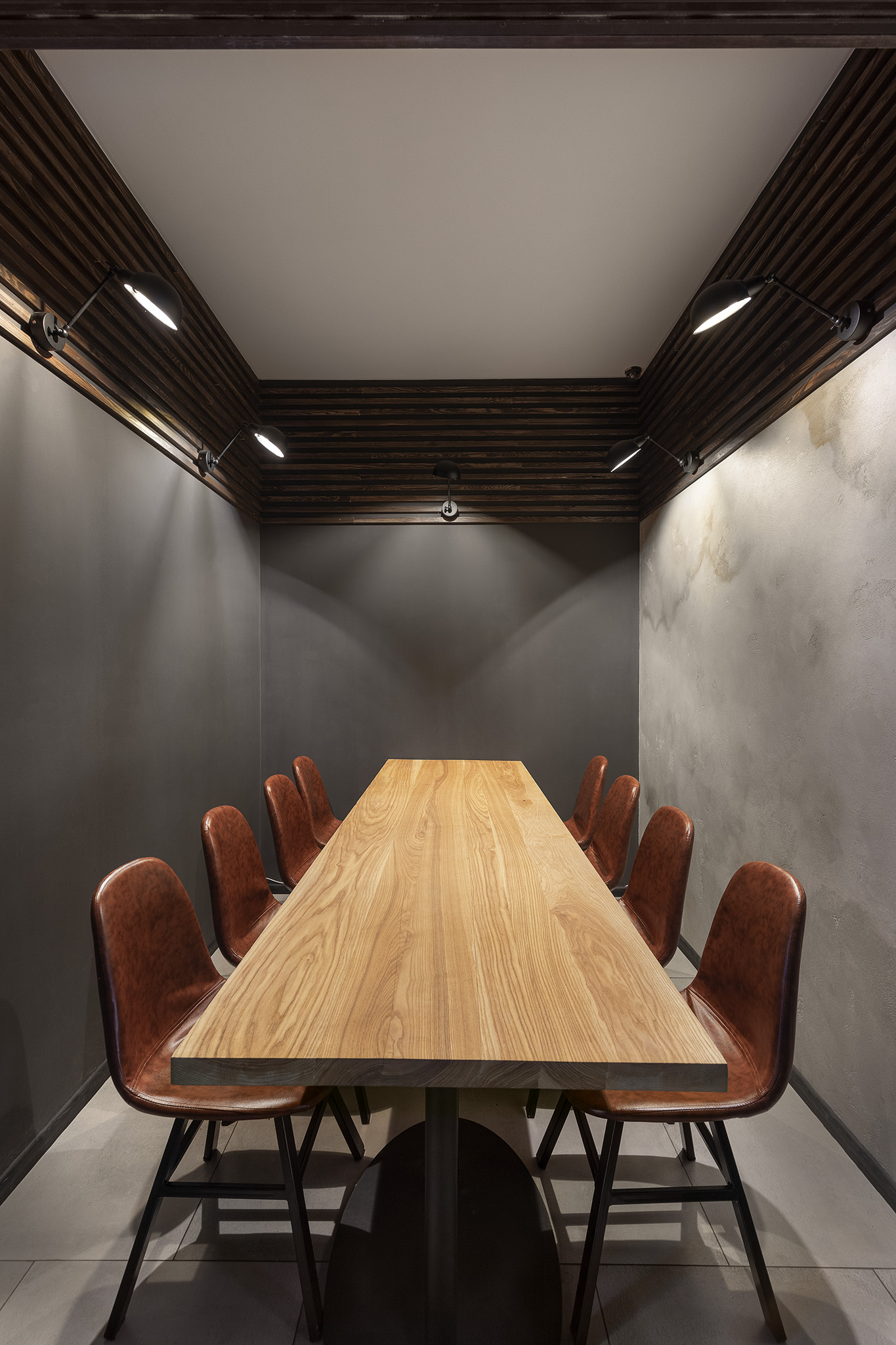 The planning decision involves the allocation of the following zones: a functional kitchen, two pub halls, a VIP hall, a utility room for a keg room, and a space for bathrooms. The main idea of the space is the bar counter, which has become a bright accent of the pub's interior. Getting into the first hall, it is impossible not to notice the bar counter with seating along it, a large number of beer taps and accent light. The bar counter divides the room into two functional zones - a dining area, and an auxiliary one - a kitchen, a keg room and bathrooms. Between the two halls there is a VIP hall for 10 people. The second hall is a competent interior of the pub - soft, sofa seating, communal tables for companies and tables for two and four. The "heart" of the DAF pub is stored in the keg - beer. A huge number of kegs are placed here, and for ease of operation and connection of kegs to taps, at the construction stage, a pipe system was laid in the floor between the bar and the utility room.