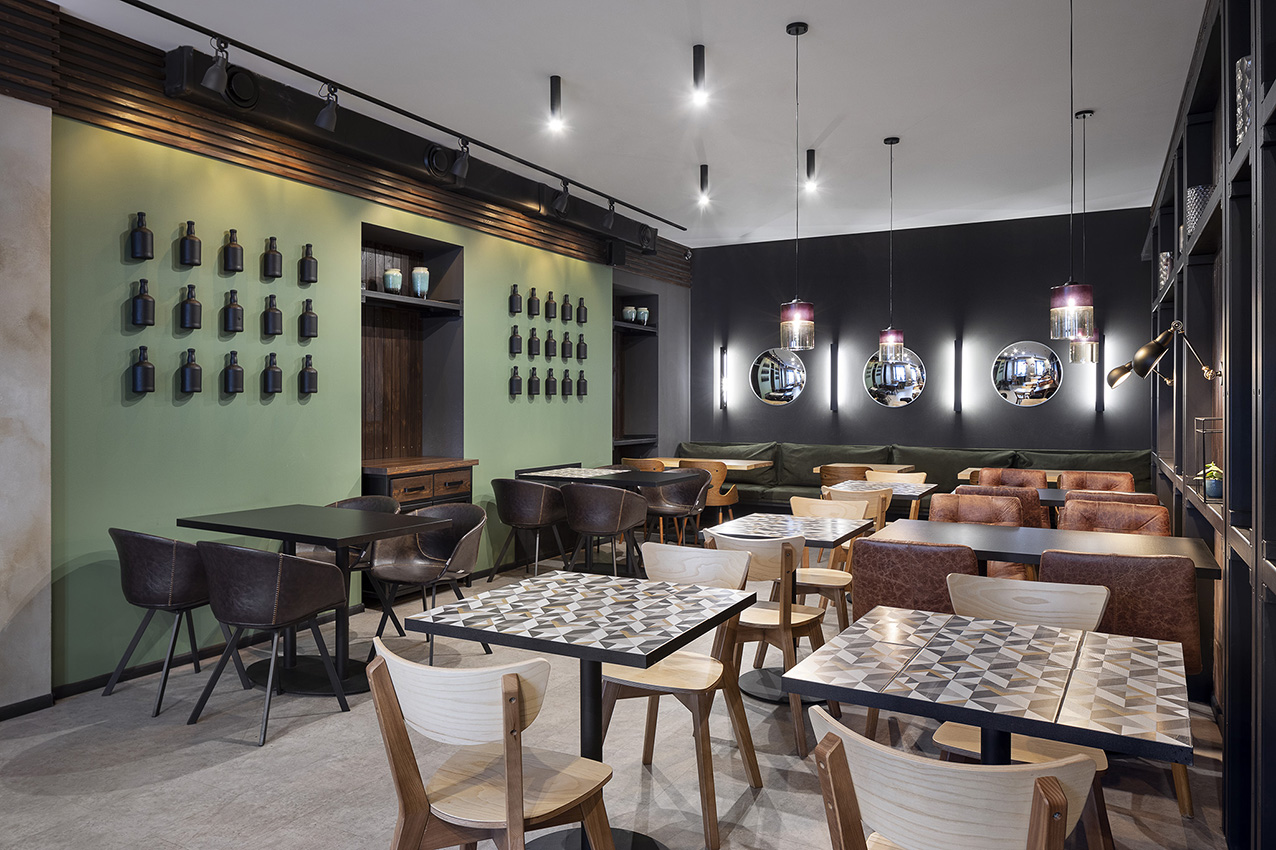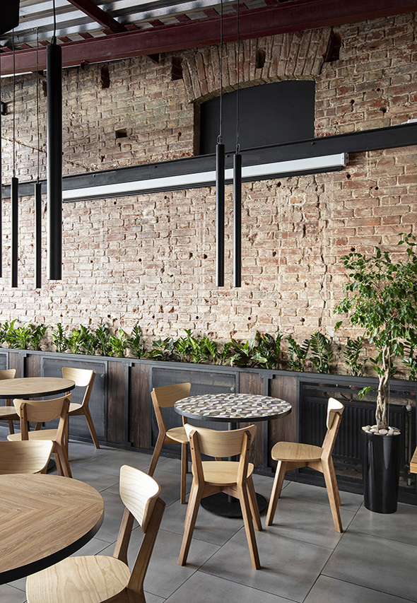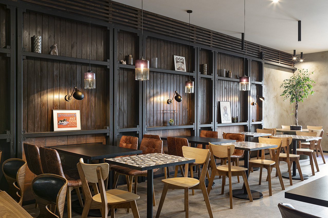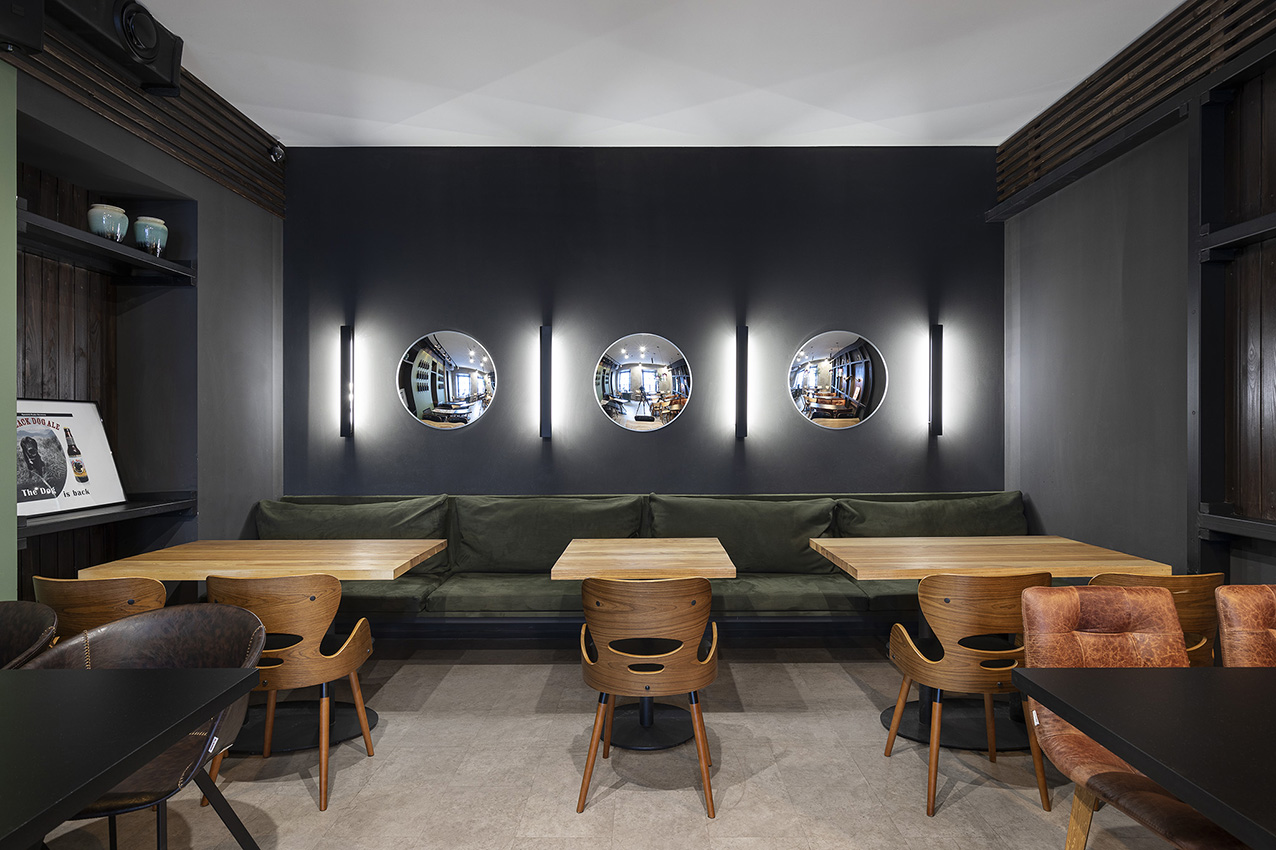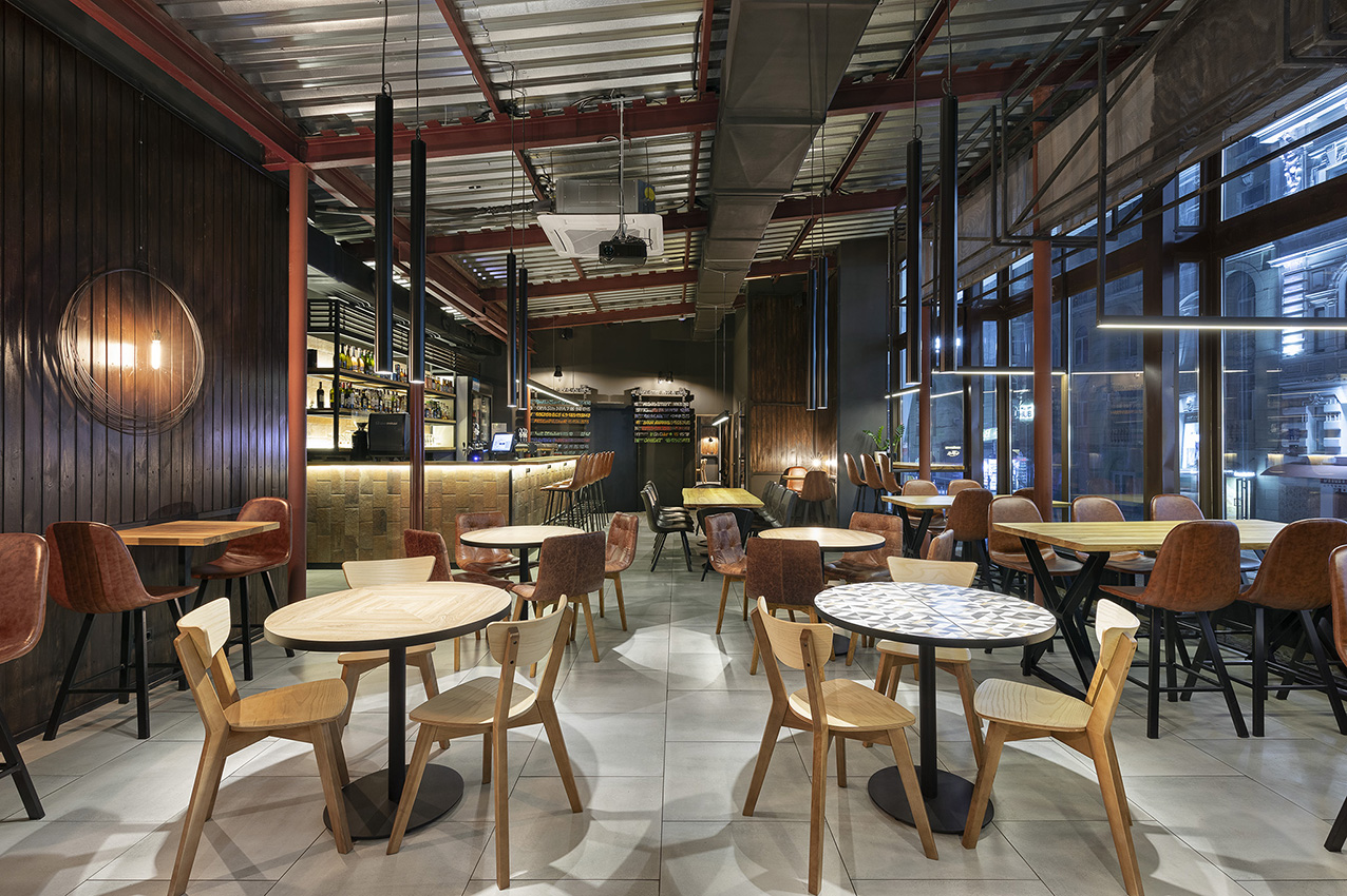 The planning decision involves the allocation of the following zones: a functional kitchen, two pub halls, a VIP hall, a utility room for a keg room, and a space for bathrooms. The main idea of the space is the bar counter, which has become a bright accent of the pub's interior. Getting into the first hall, it is impossible not to notice the bar counter with seating along it, a large number of beer taps and accent light. The bar counter divides the room into two functional zones - a dining area, and an auxiliary one - a kitchen, a keg room and bathrooms. Between the two halls there is a VIP hall for 10 people. The second hall is a competent interior of the pub - soft, sofa seating, communal tables for companies and tables for two and four. The "heart" of the DAF pub is stored in the keg - beer. A huge number of kegs are placed here, and for ease of operation and connection of kegs to taps, at the construction stage, a pipe system was laid in the floor between the bar and the utility room.