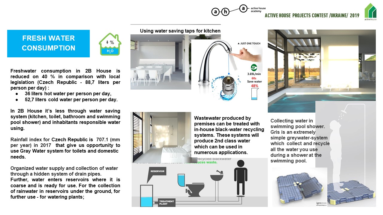 At 2B House, water saving is ensured by the introduction of special water-saving fittings (kitchen, toilet, bathroom and pool shower), as well as responsible water consumption by the residents of the house.