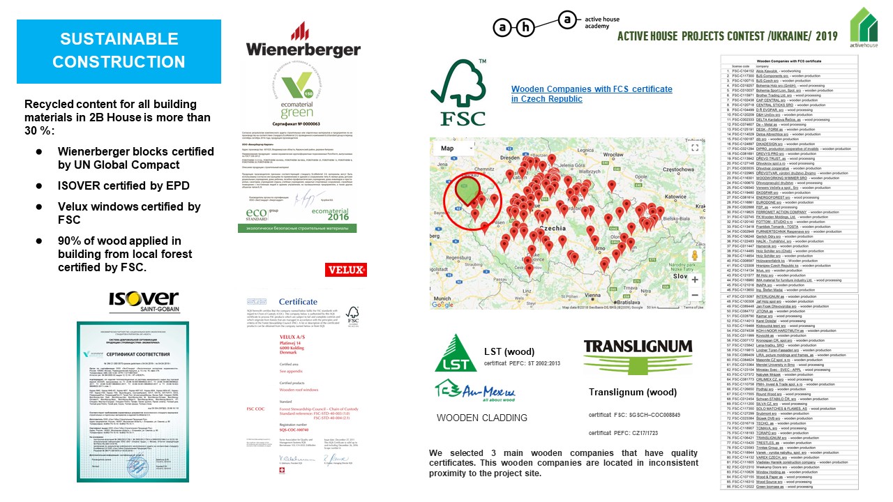 The percentage of building materials recyclable at 2B House is over 30% and is EPD and FSC certified: