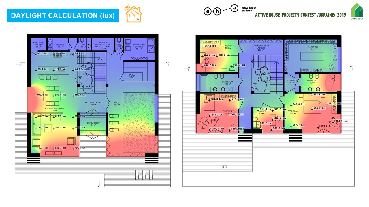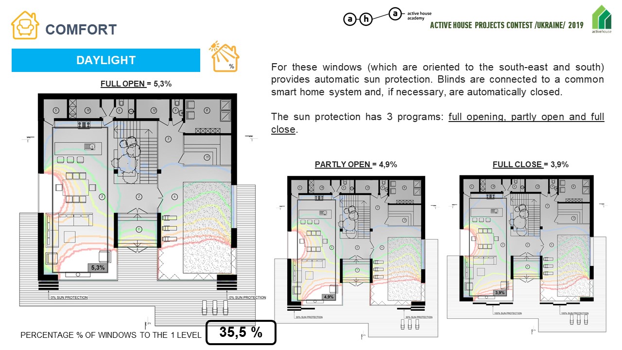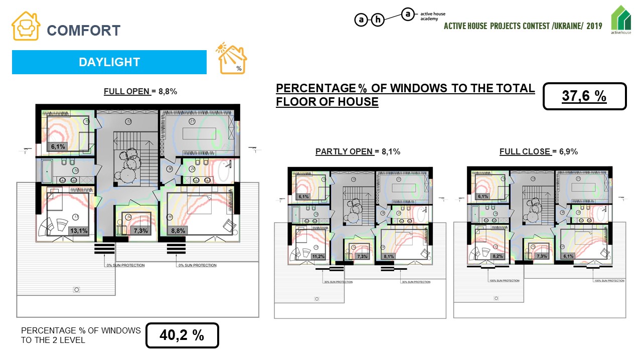 One of the indicators of Active House comfort is KEO (natural light factor) and the percentage of glazing in the room relative to the floor area of the room.