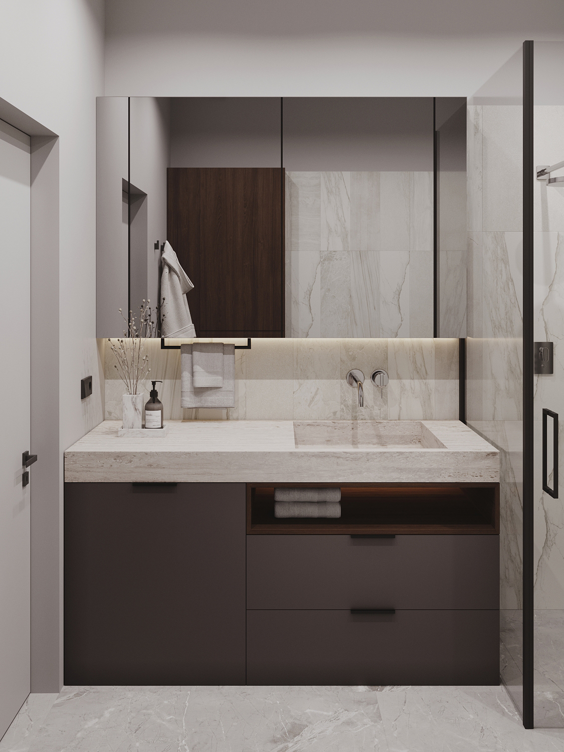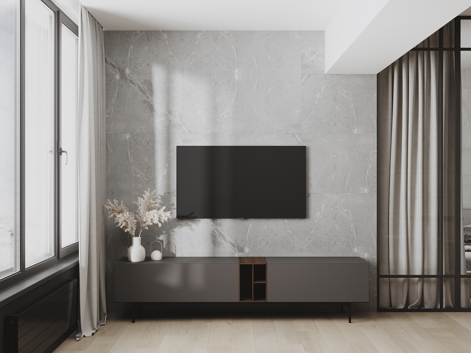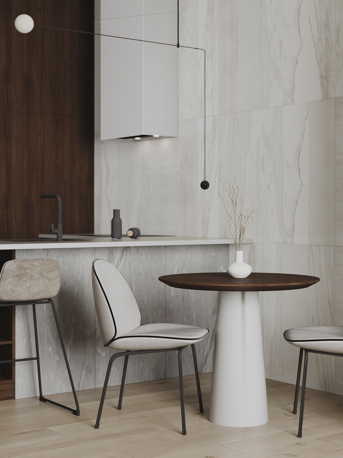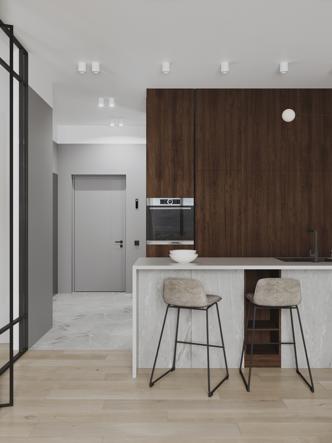 — современный дизайн кухни-гостиной получился за счет лаконичной п-образной кухни, без верхних шкафов и с островной вытяжкой: использования шпонированных фасадов на контрасте с мраморной плиткой, разных текстур и фактур. Дополняет интерьер в стиле минимализм металлическая перегородка в стиле лофт нетривиального переплета, которая отделяет кухню-гостиную от зоны спальни. Стеклянная перегородка в интерьере – это модное решение, используемое в проектах, здесь главное найти уникальный ритм, подобрать цвет порошковой покраски и качественную фурнитуру. В проекте интерьера двухкомнатной квартиры выполненной в стиле минимализм команда IK-architects грамотно вписала элементы лофта, который подчеркнули тонкую игру цветов, фактур и материалов.