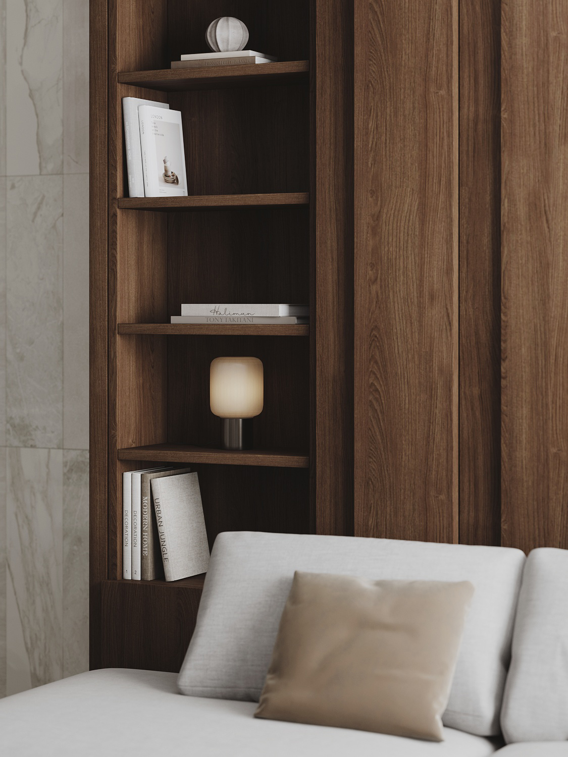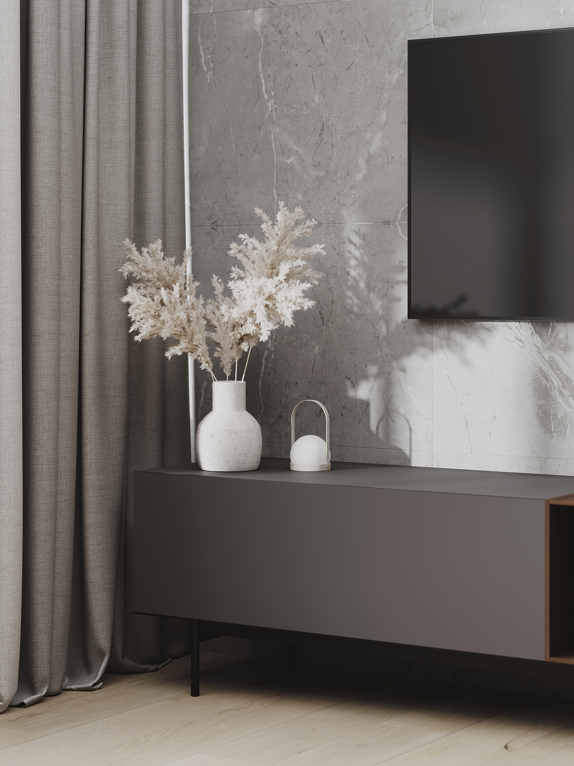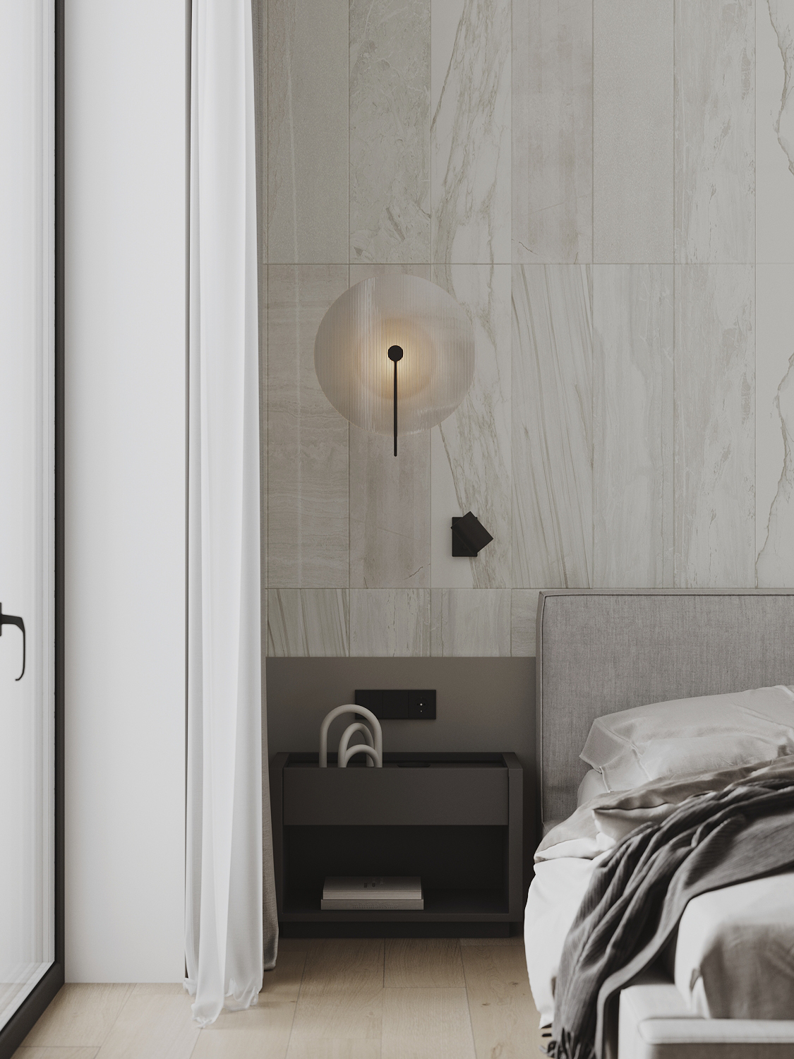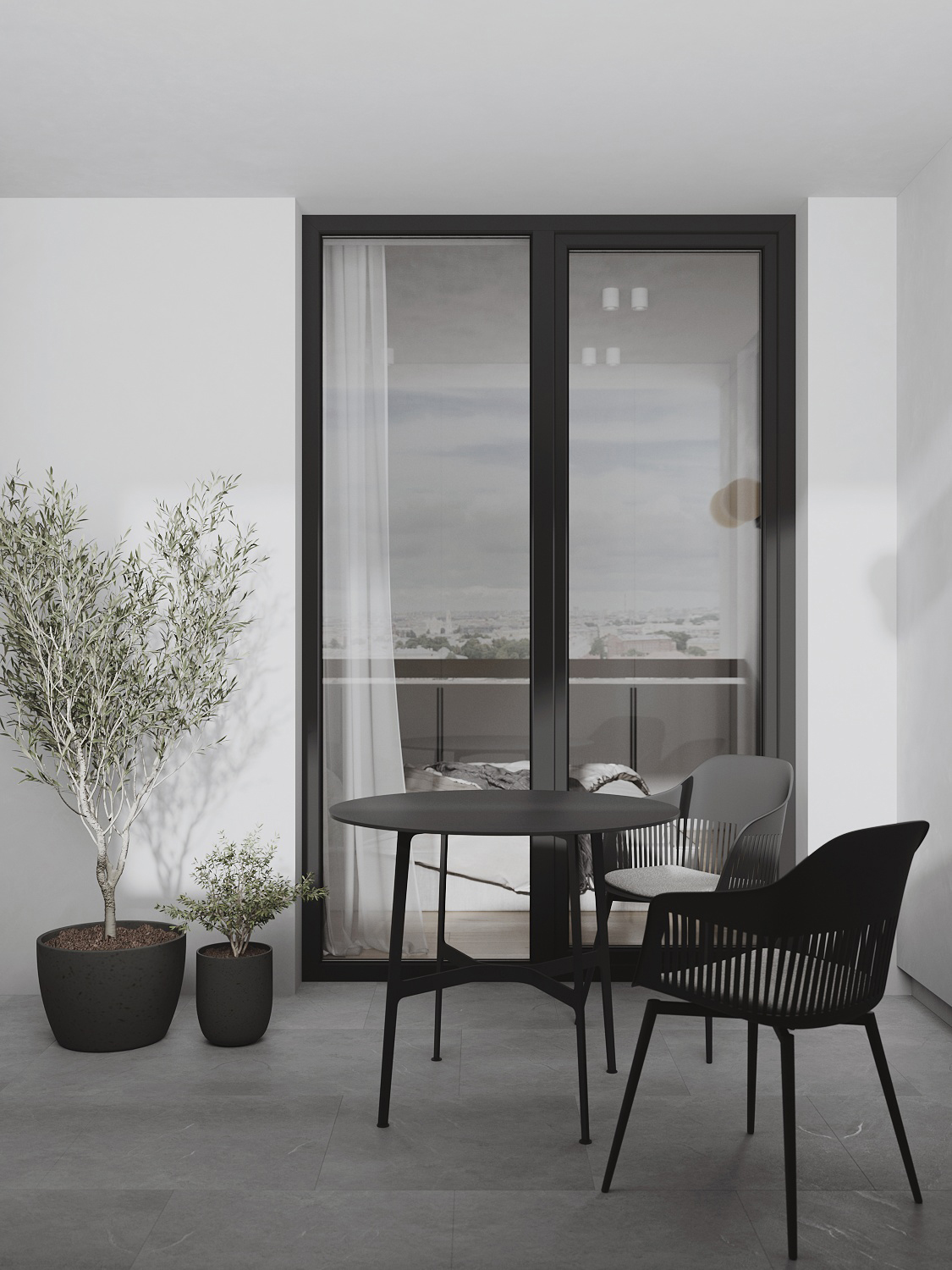 — современный дизайн кухни-гостиной получился за счет лаконичной п-образной кухни, без верхних шкафов и с островной вытяжкой: использования шпонированных фасадов на контрасте с мраморной плиткой, разных текстур и фактур. Дополняет интерьер в стиле минимализм металлическая перегородка в стиле лофт нетривиального переплета, которая отделяет кухню-гостиную от зоны спальни. Стеклянная перегородка в интерьере – это модное решение, используемое в проектах, здесь главное найти уникальный ритм, подобрать цвет порошковой покраски и качественную фурнитуру. В проекте интерьера двухкомнатной квартиры выполненной в стиле минимализм команда IK-architects грамотно вписала элементы лофта, который подчеркнули тонкую игру цветов, фактур и материалов.