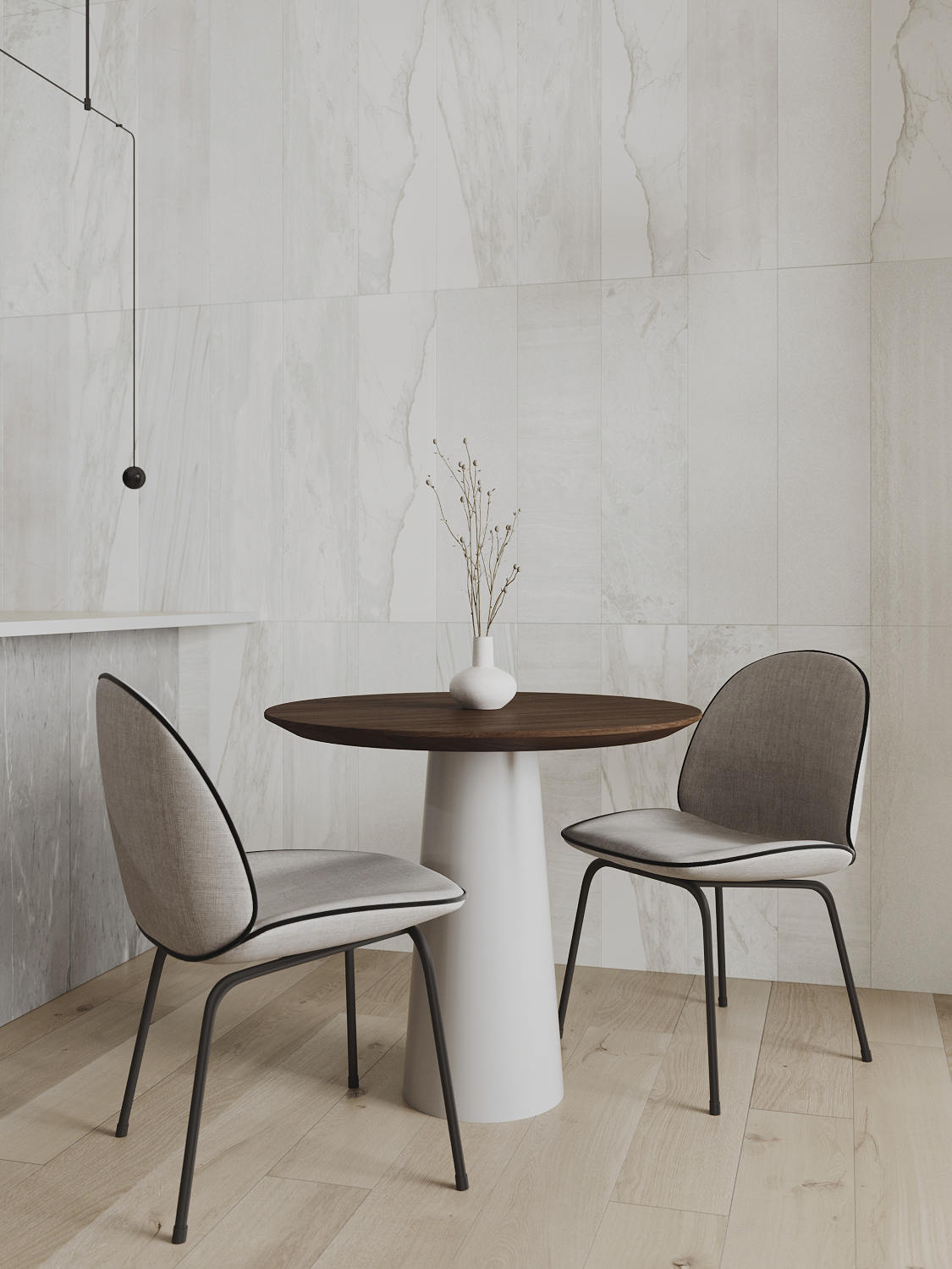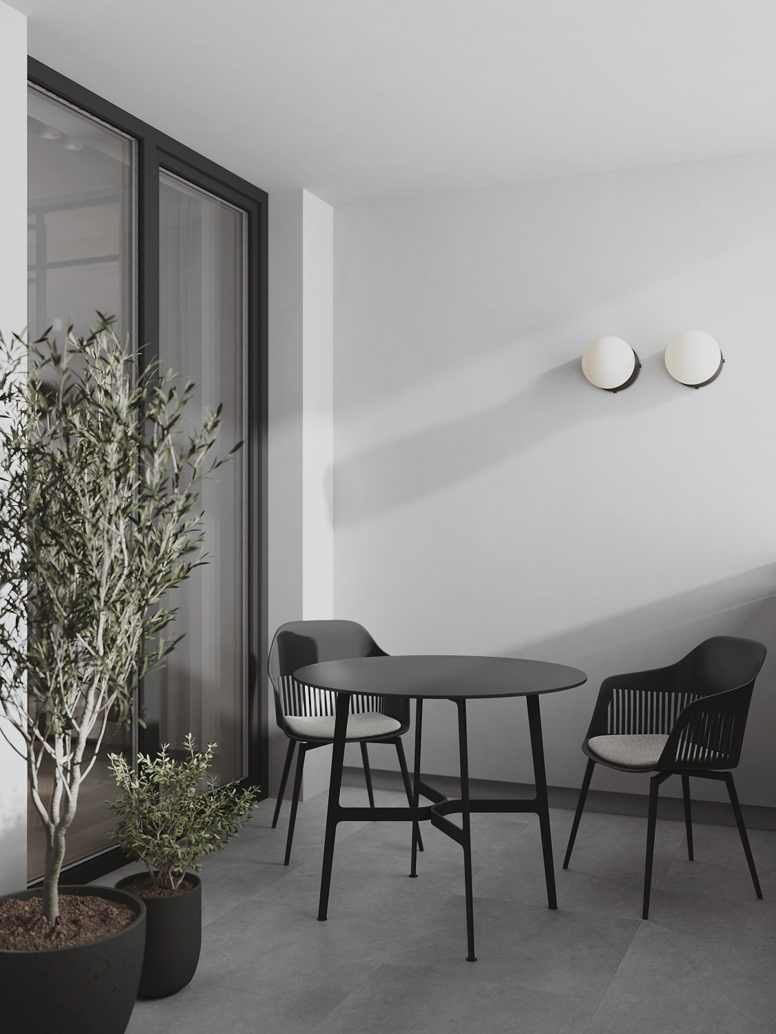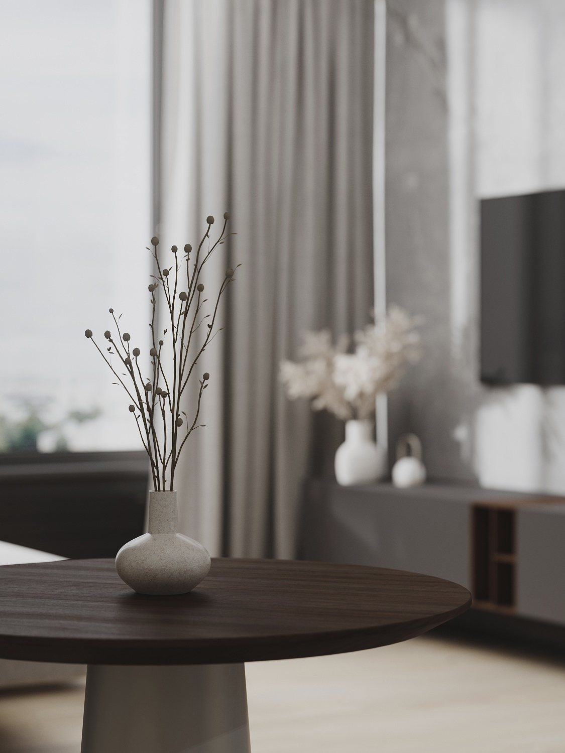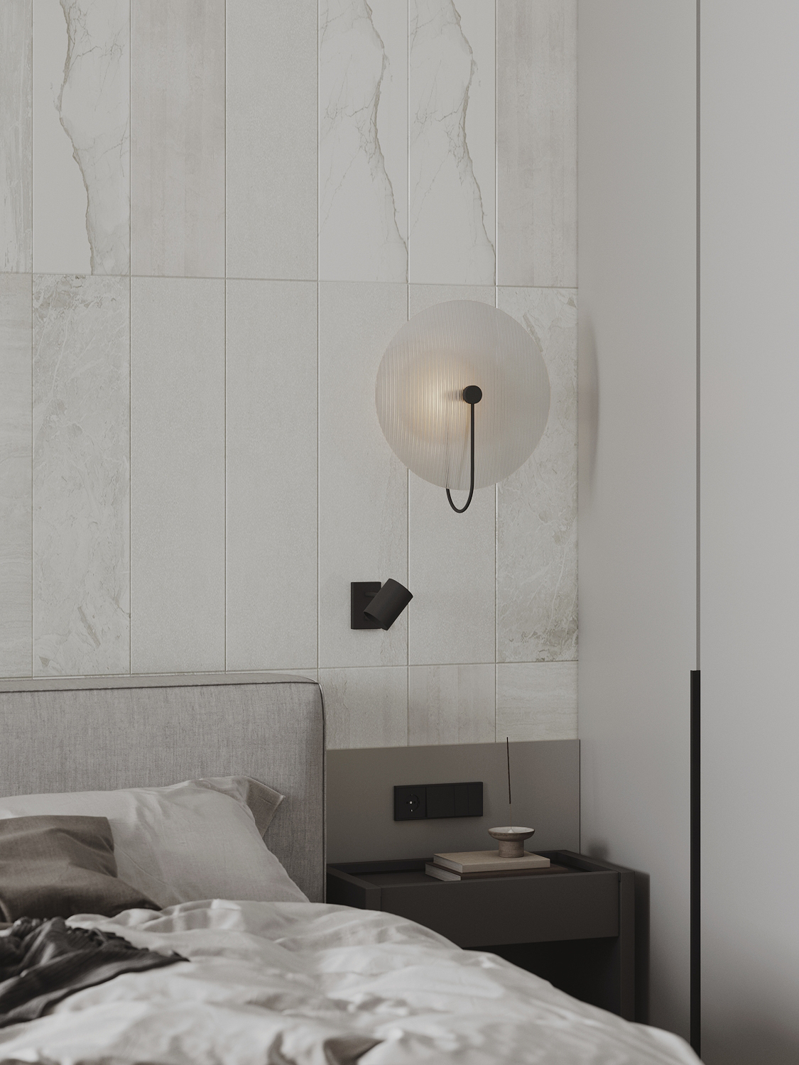 — современный дизайн кухни-гостиной получился за счет лаконичной п-образной кухни, без верхних шкафов и с островной вытяжкой: использования шпонированных фасадов на контрасте с мраморной плиткой, разных текстур и фактур. Дополняет интерьер в стиле минимализм металлическая перегородка в стиле лофт нетривиального переплета, которая отделяет кухню-гостиную от зоны спальни. Стеклянная перегородка в интерьере – это модное решение, используемое в проектах, здесь главное найти уникальный ритм, подобрать цвет порошковой покраски и качественную фурнитуру. В проекте интерьера двухкомнатной квартиры выполненной в стиле минимализм команда IK-architects грамотно вписала элементы лофта, который подчеркнули тонкую игру цветов, фактур и материалов.
