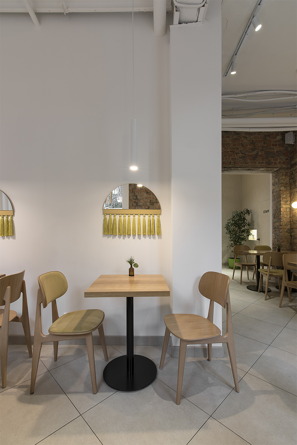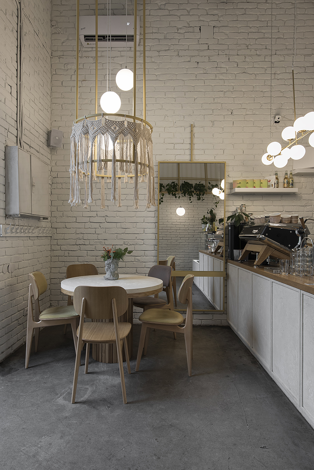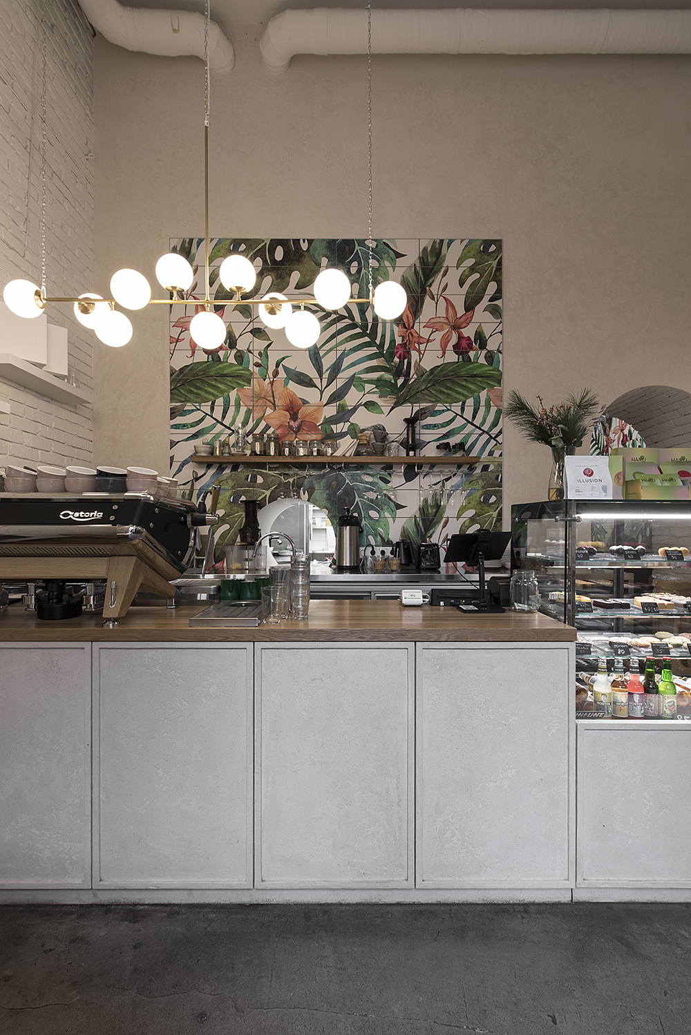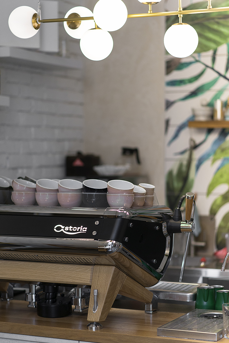 Ключевую роль в интерьере занимает – барная стойка – это всегда красивая кофемашина, большая витрина с ПП десертами и огромная функционально-техническая зона, позволяющая выполнять ряд процессов. Здесь должно внимания всегда стоит уделить технологии бара, расстановки оборудовании, соседству их между собой; также очень важно расположение кофемашины, в наших проектах мы размещаем их на фронтальном или боковом баре, чтобы бариста всегда видел гостя и мог с ним коммуницировать.