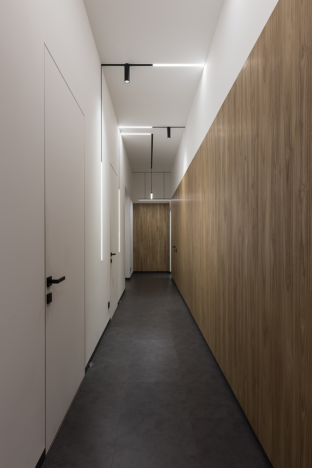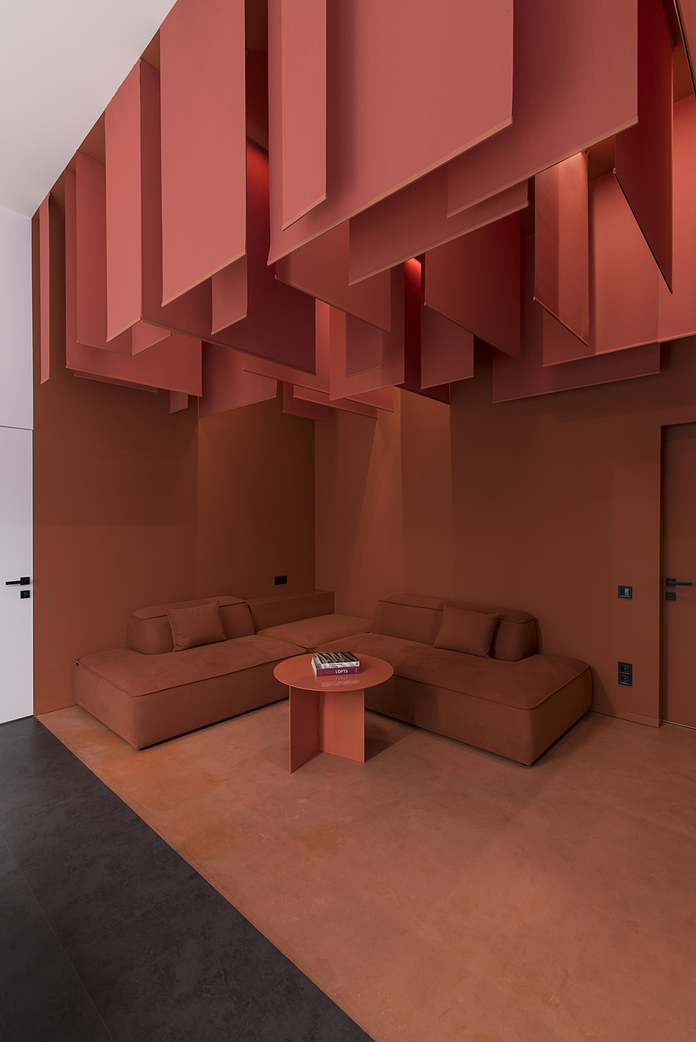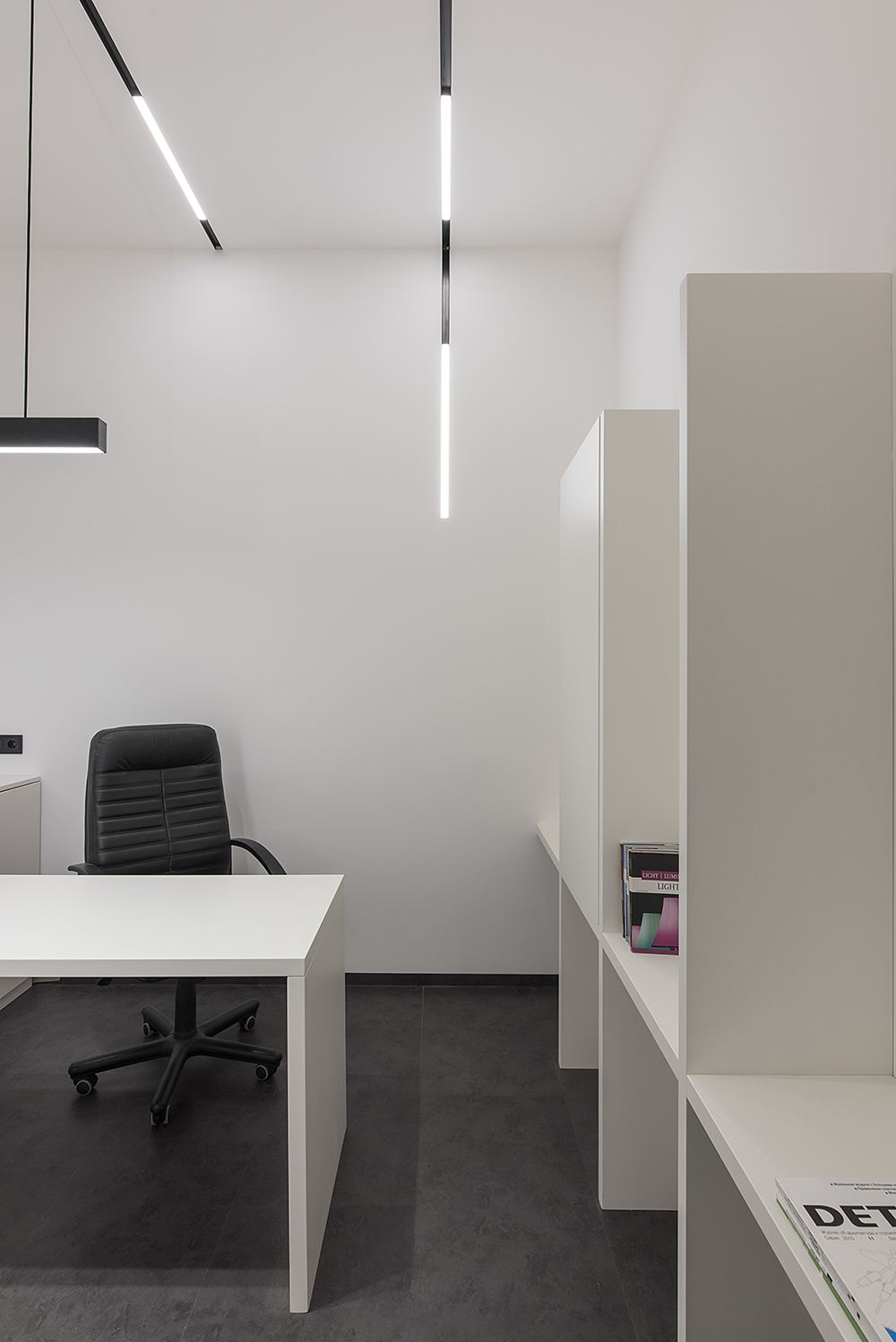 Магнитно-трековые светильники в виде полос, переходящих с потолка на стену или в пространственную световую композицию, своего рода арт-объекты, создали связующую нить между помещениями. На заказ будут изготавливаться стол переговоров, акустические панели, доработана стандартная модель дивана под индивидуальный размер. Двери скрытого монтажа будут изготовлены на заказ на фабрике Папа Карло.