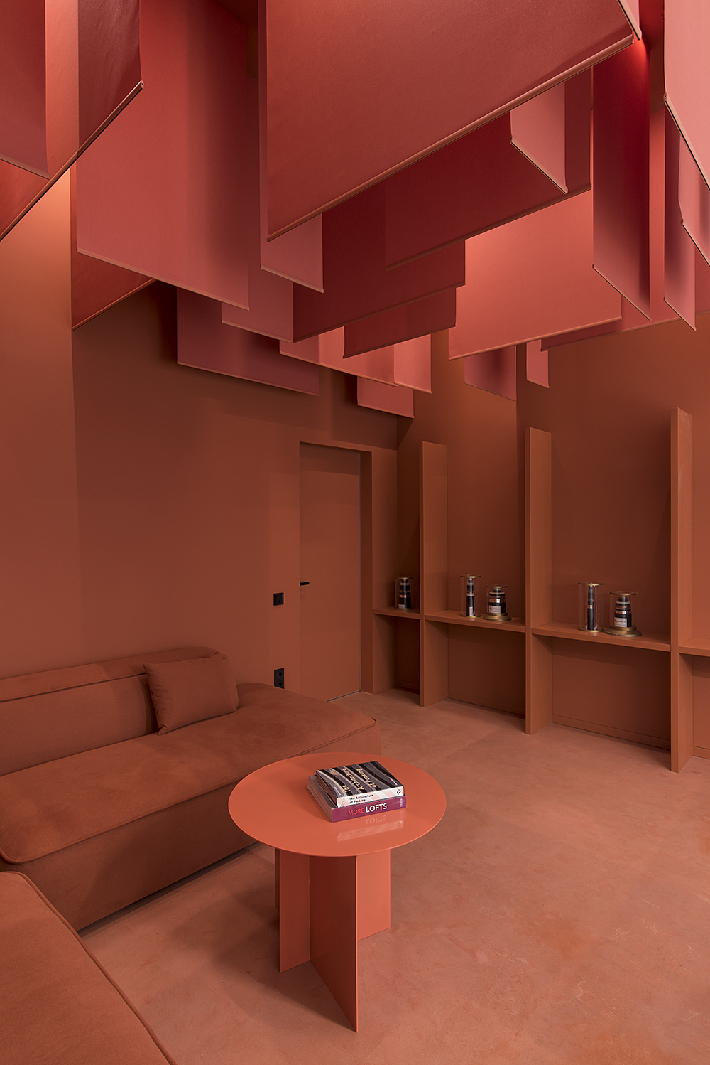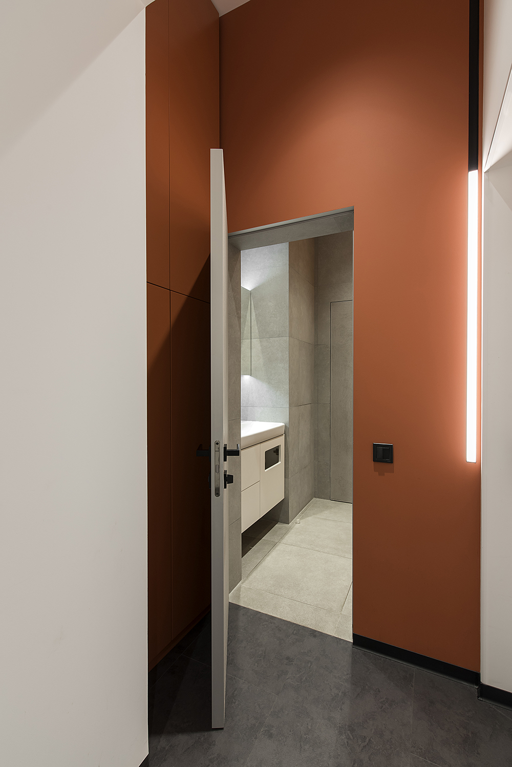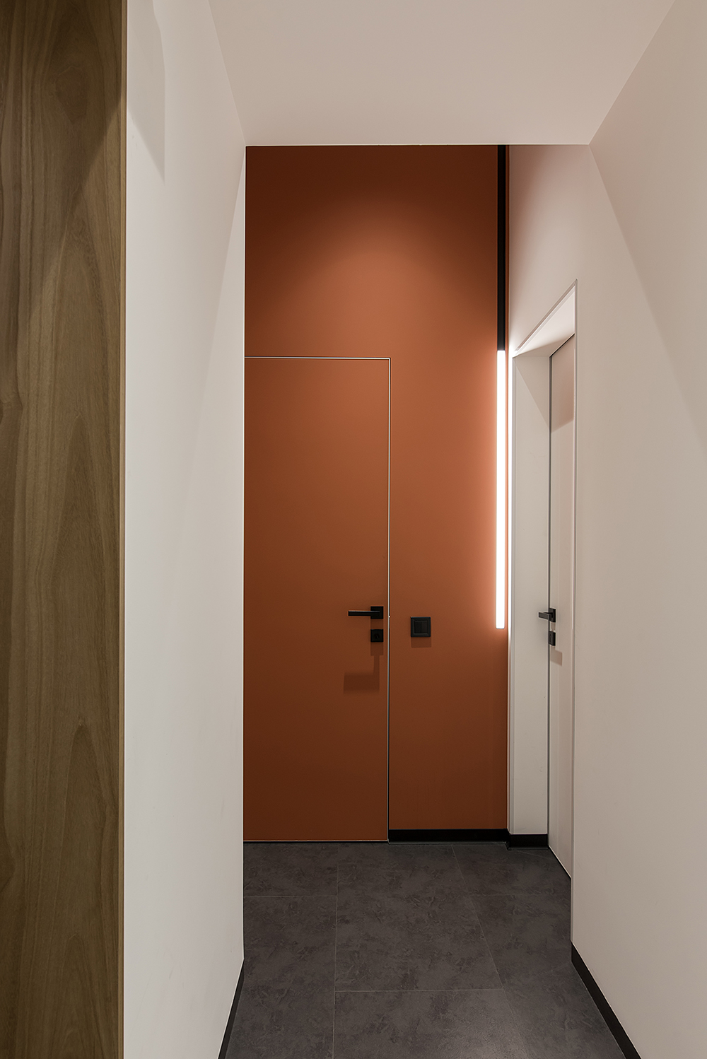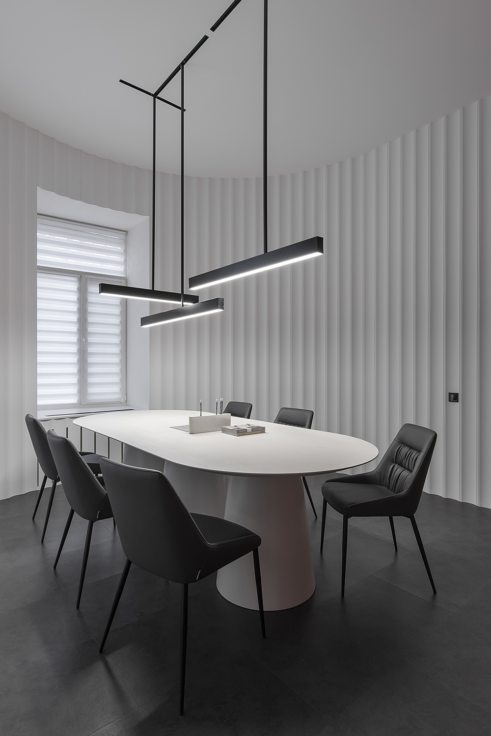 Магнитно-трековые светильники в виде полос, переходящих с потолка на стену или в пространственную световую композицию, своего рода арт-объекты, создали связующую нить между помещениями. На заказ будут изготавливаться стол переговоров, акустические панели, доработана стандартная модель дивана под индивидуальный размер. Двери скрытого монтажа будут изготовлены на заказ на фабрике Папа Карло.