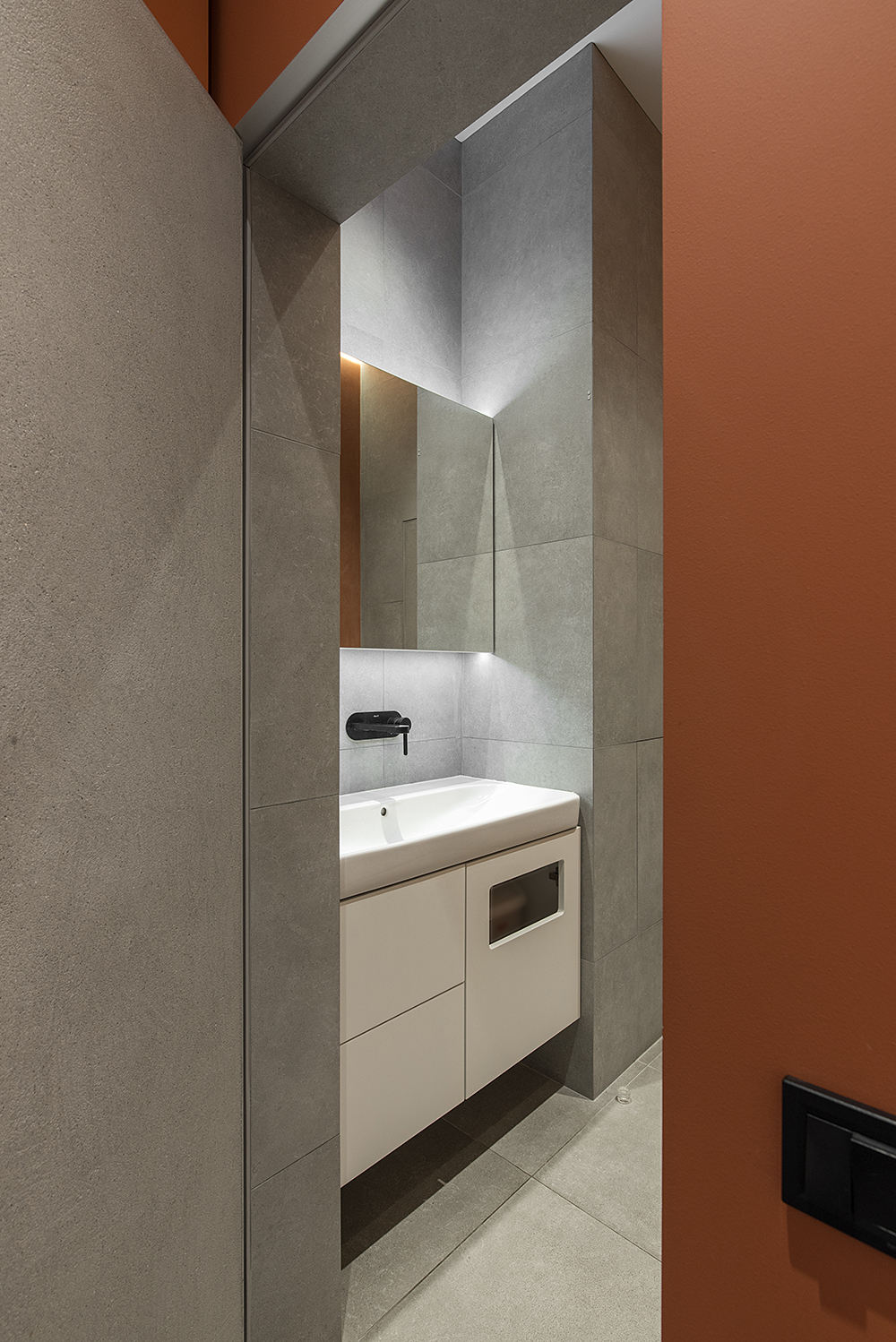 В отделке дизайна офиса в минималистическом стиле использовали дерево, винил под камень и микроцемент— это отсылка к технологическому принципу компании. Цветовая гамма выдержана в нежных светлых тонах, но есть и сложные оттенки: терракотовый, графит. В самом офисе много оранжево-терракотовых элементов — таблички на дверях, плитка в санузле, стулья и тд — стали акцентами интерьера.