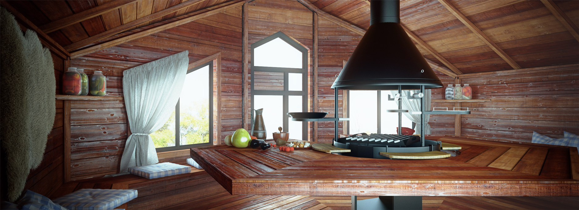 function: grill house, where you can fry the meat, vegetables and spend your time