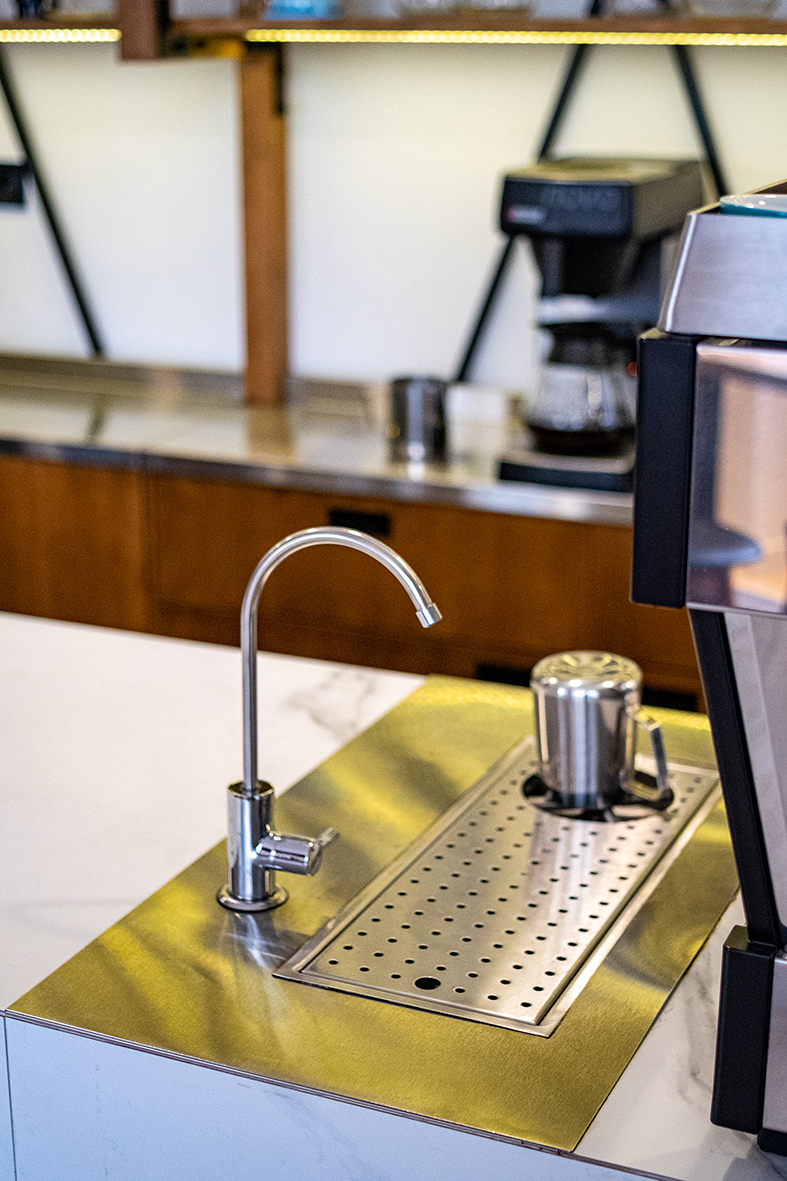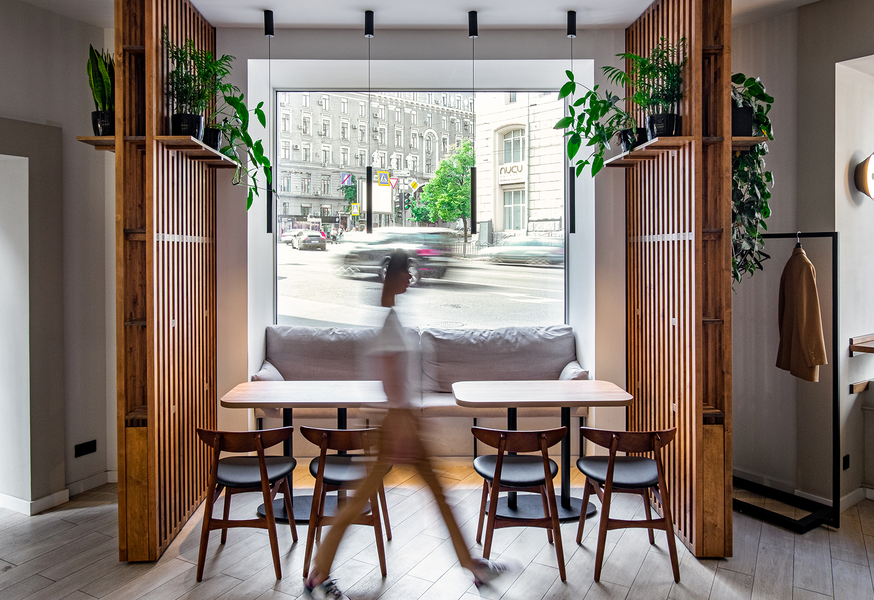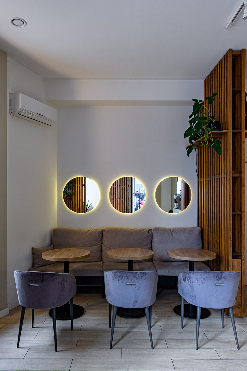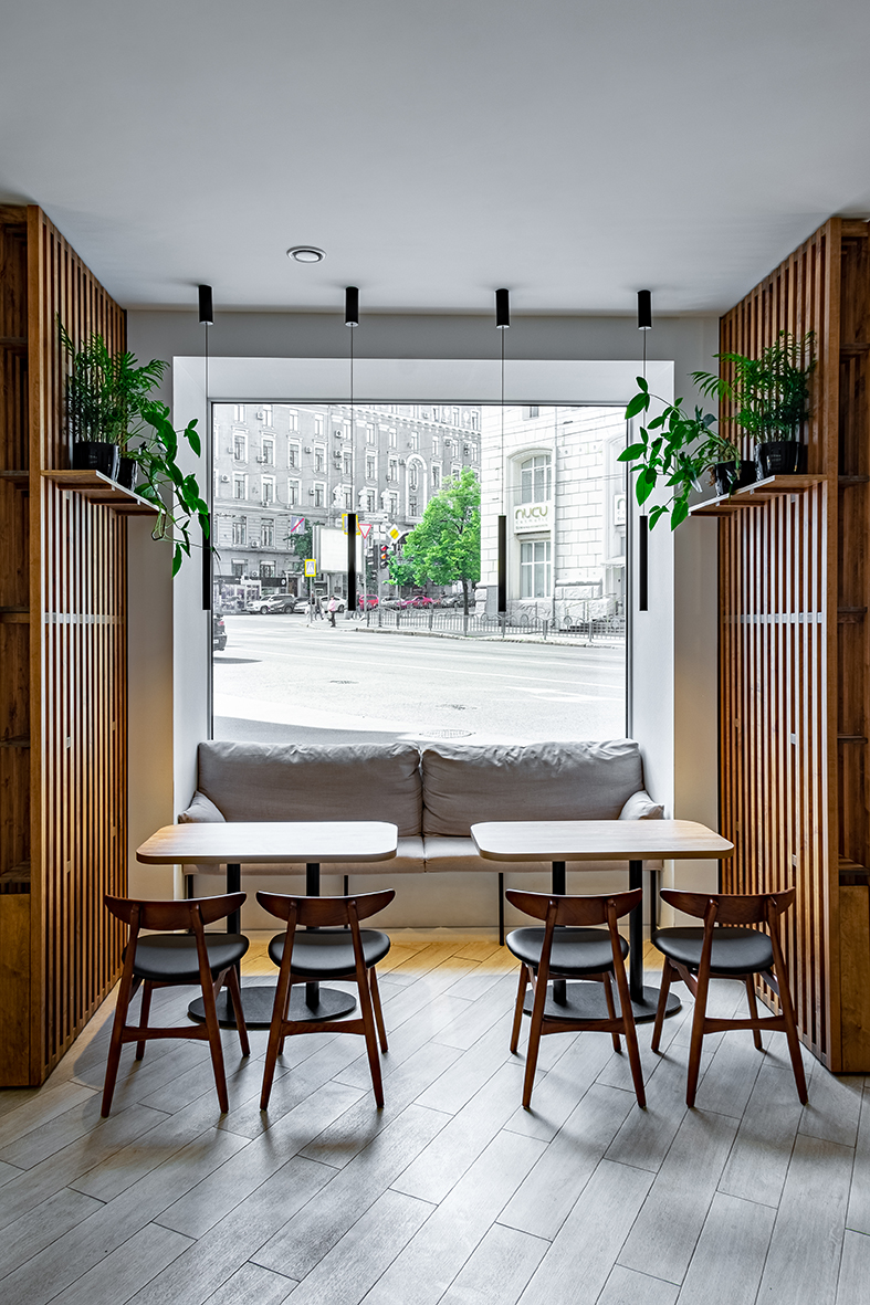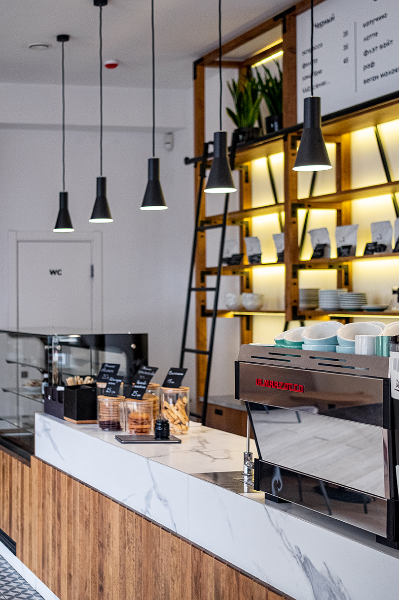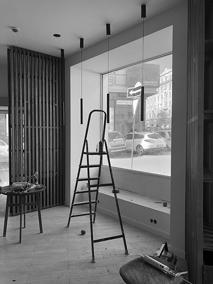 «Rabbit coffee place» (пока без вывески) находится в доходном доме на Армянском переулке, построенном в начале ХХ века. Интерьер, под стать философии обжарщика, получился минималистичным. Пастельные оттенки, золото, дерево и панорамные окна с видом дом со шпилем – одна из визуальных доминант Харькова.