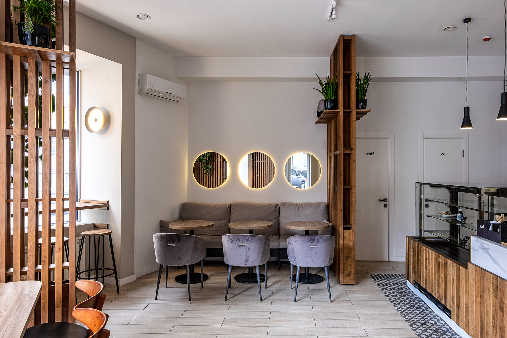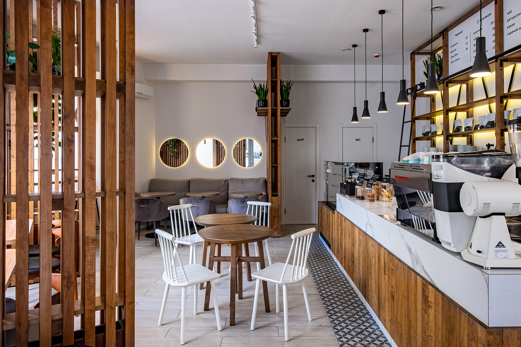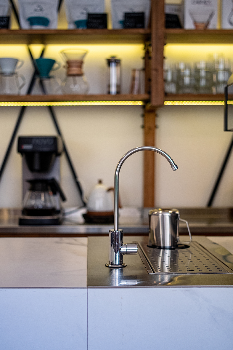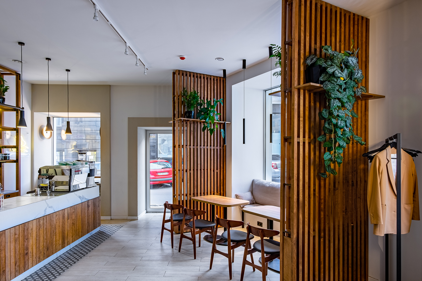 «Rabbit coffee place» (пока без вывески) находится в доходном доме на Армянском переулке, построенном в начале ХХ века. Интерьер, под стать философии обжарщика, получился минималистичным. Пастельные оттенки, золото, дерево и панорамные окна с видом дом со шпилем – одна из визуальных доминант Харькова.